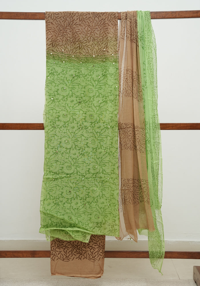 Light Brown and Green Unstitched Cotton Salwar Set With Mirror Work