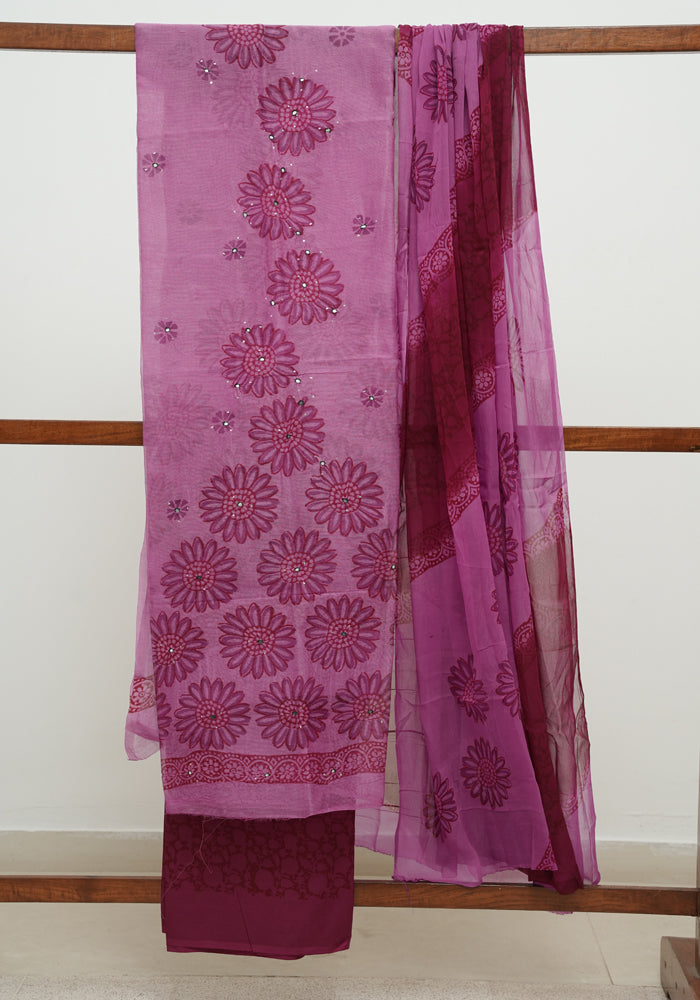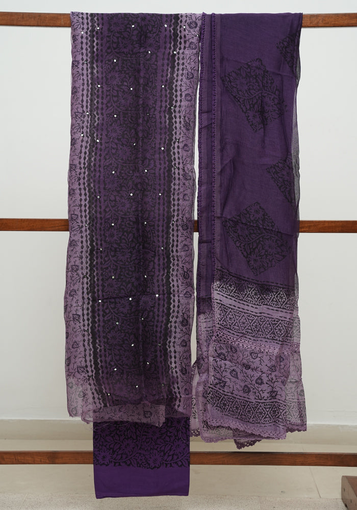 Peach and Purple Unstitched Block Printed Kota Salwar set With Crochet Dupatta