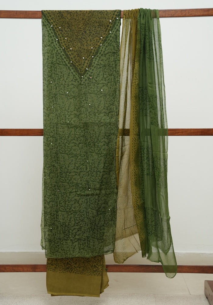 Parrot Green and Olive Green Unstitched Cotton Salwar Set With Mirror Work