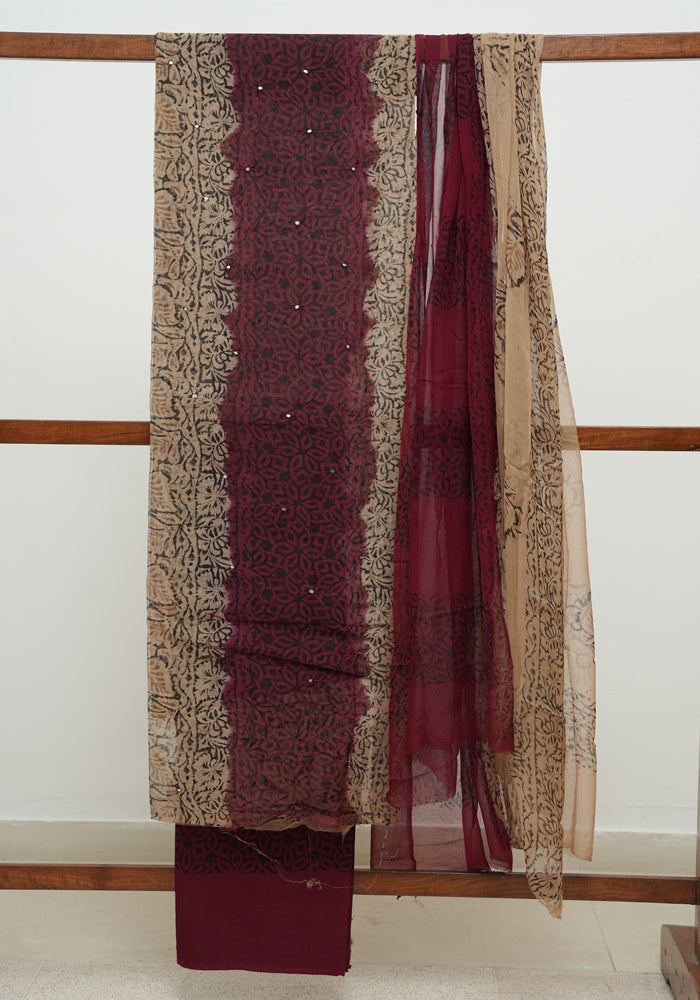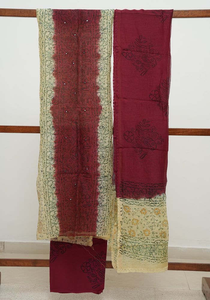 Jamun Red and Light Yellow Unstitched Block Printed Kota Salwar Set With Crochet Dupatta