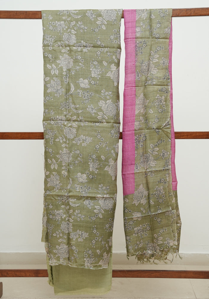 Green Tussar Silk Unstitched Salwar Set With Digital Print