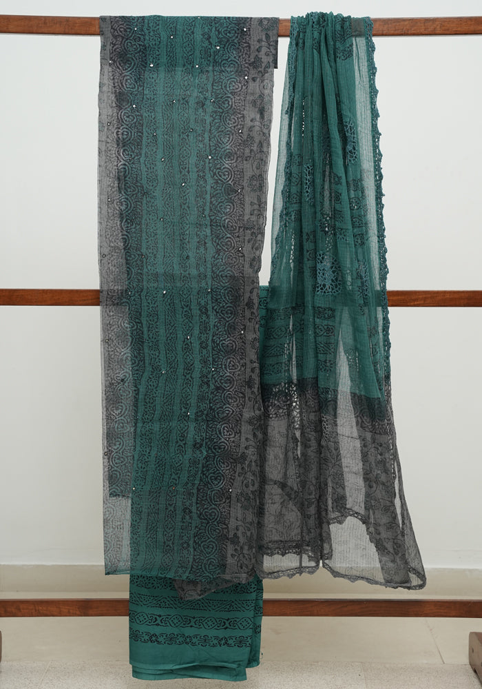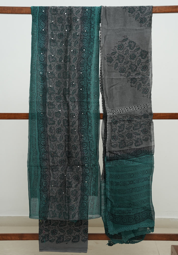 Grey and Teal Green Unstitched Block Printed Kota Salwar set With Crochet Dupatta
