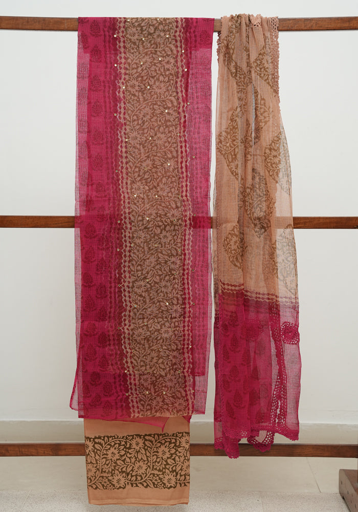 Peach and Light Purple Unstitched Block Printed Kota Salwar Set With Crochet Dupatta