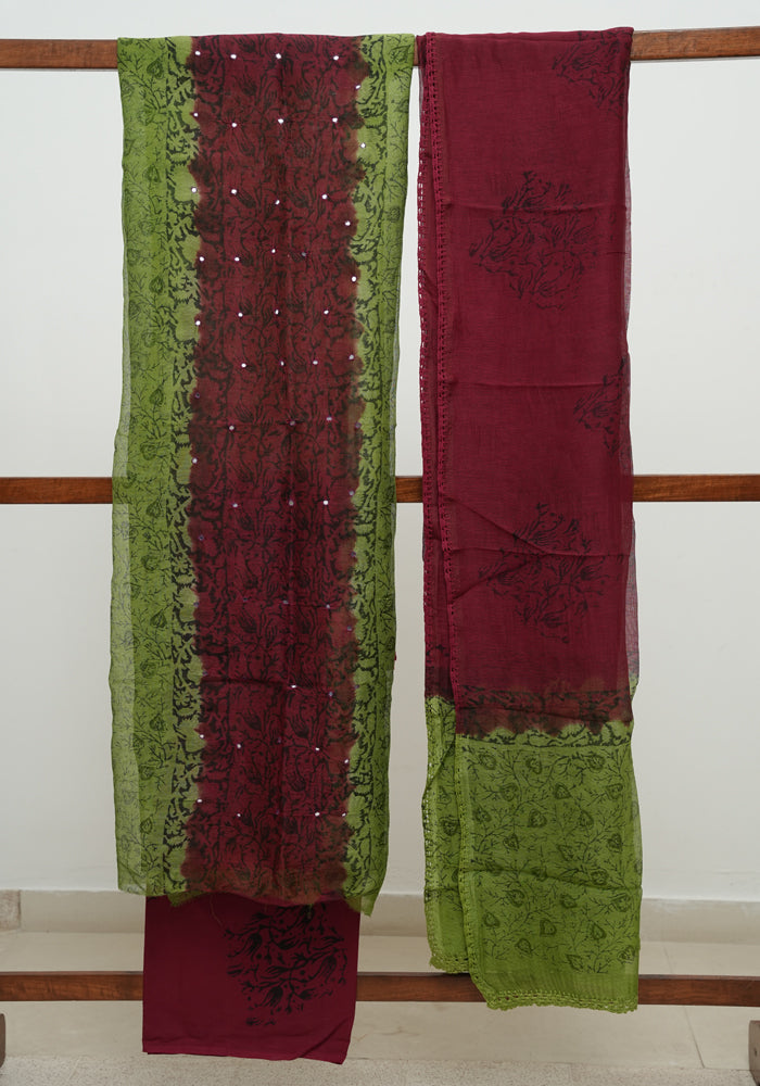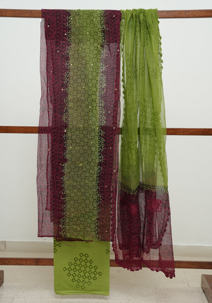 Jamun Red and Parrot Green Unstitched Block Printed Kota Salwar Set With Crochet Dupatta