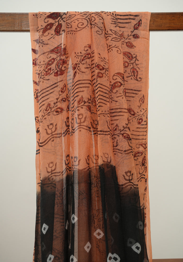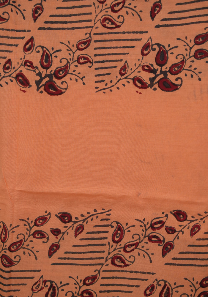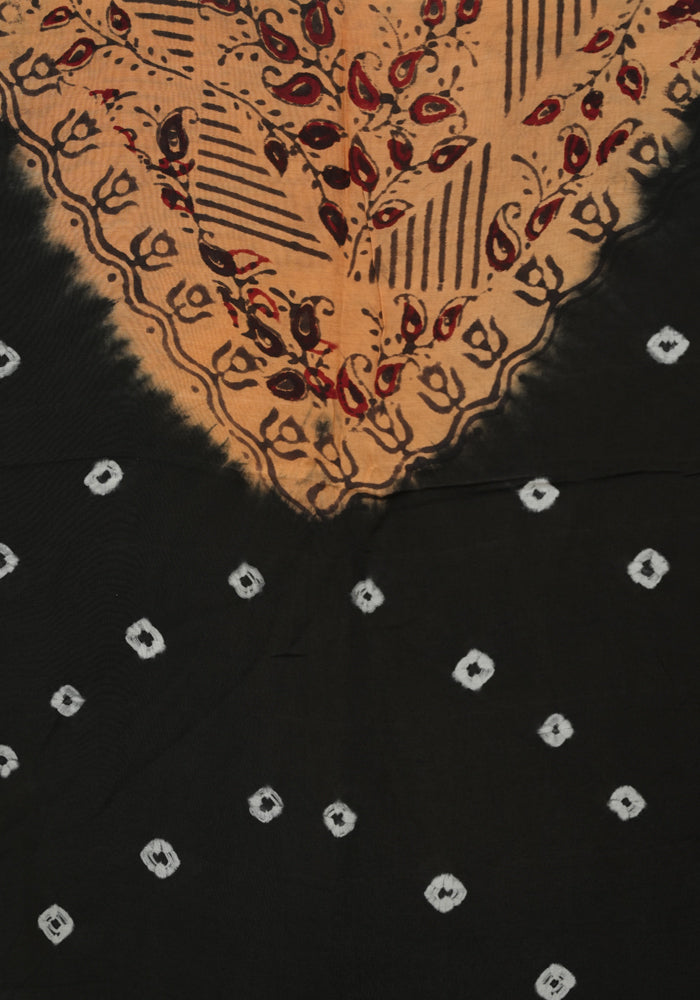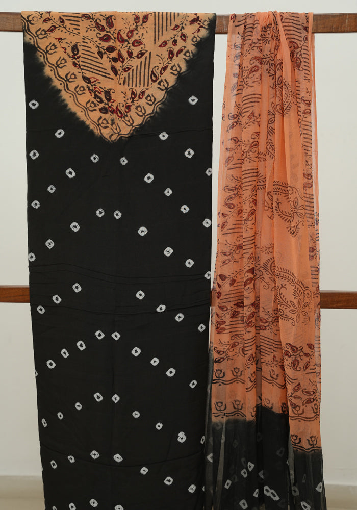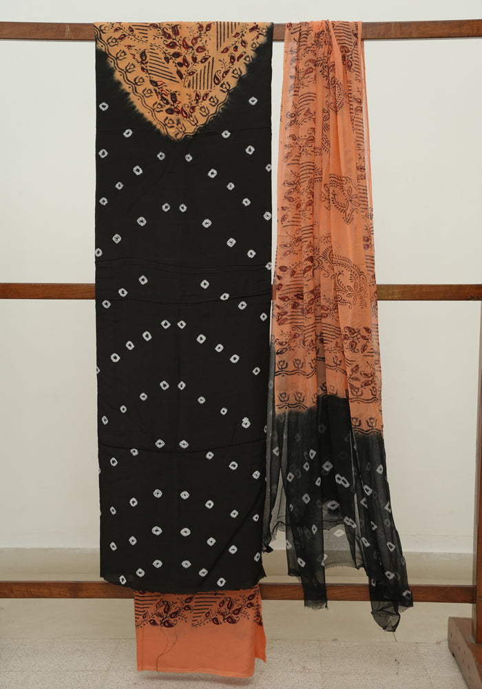 Black and Light Orange Unstitched Block Printed Muslin Salwar Set With Bandini