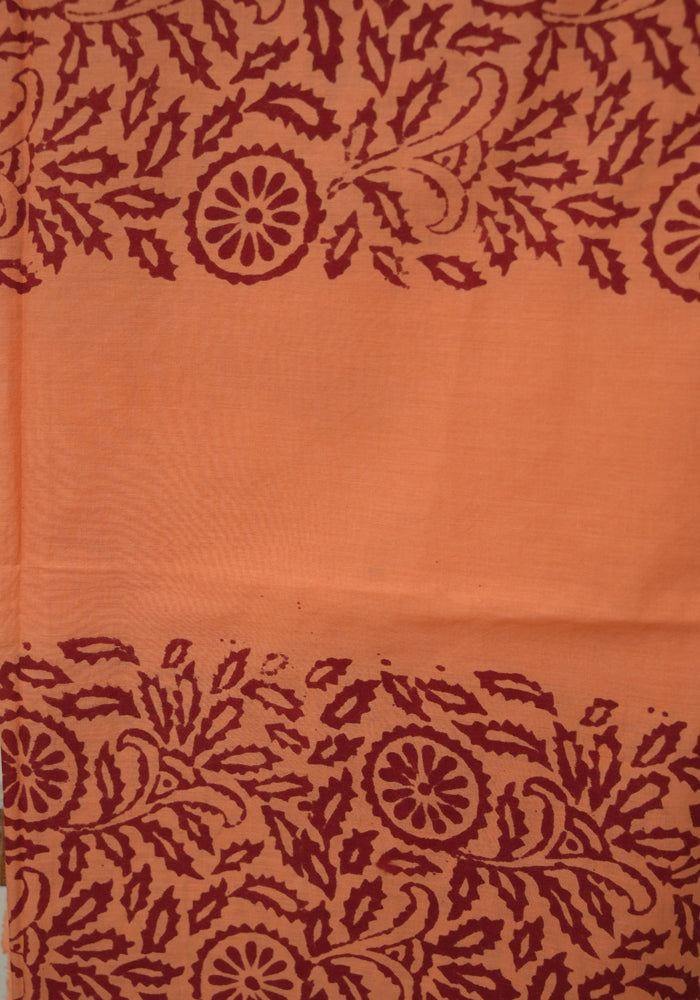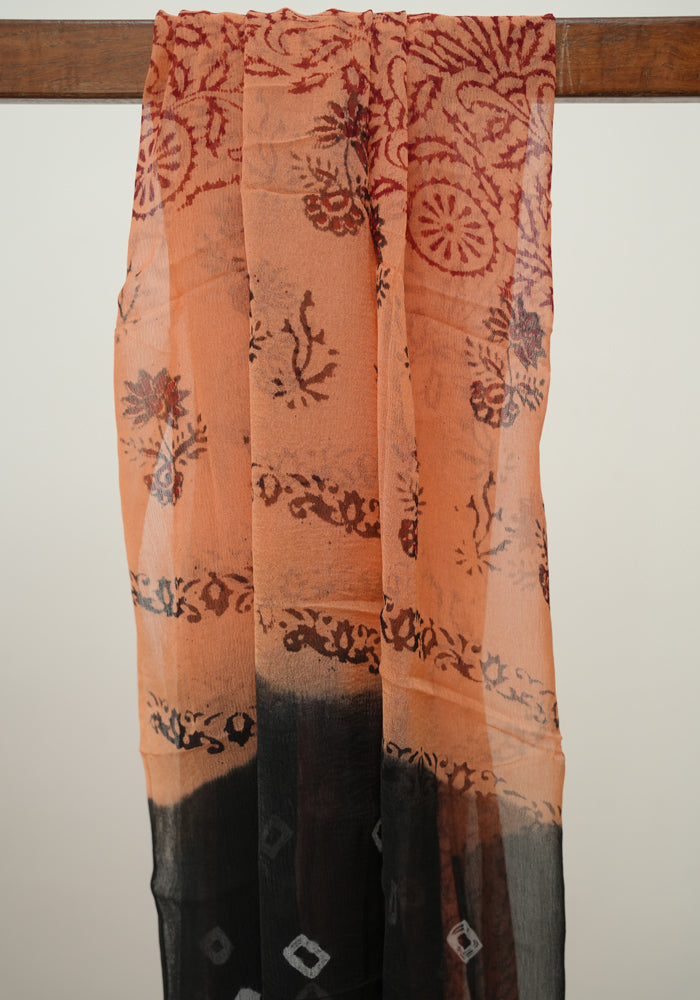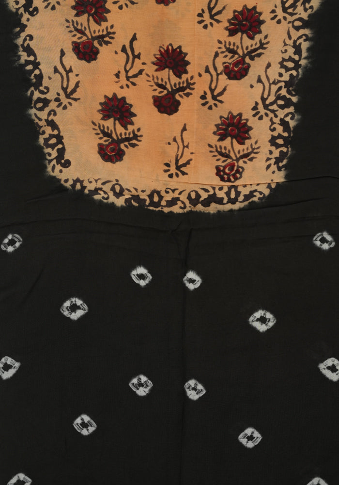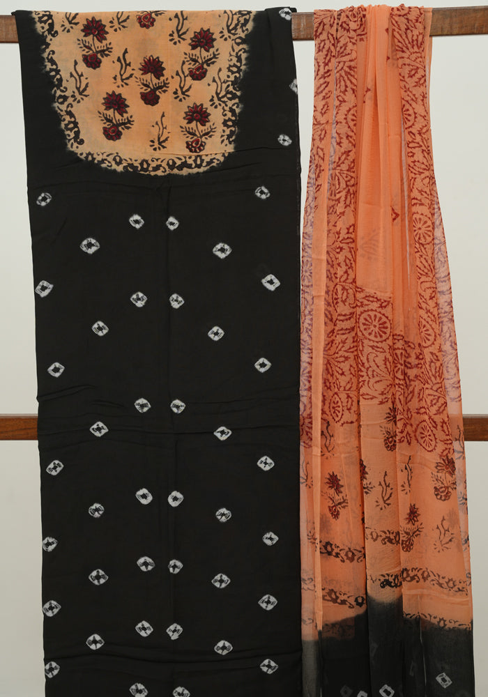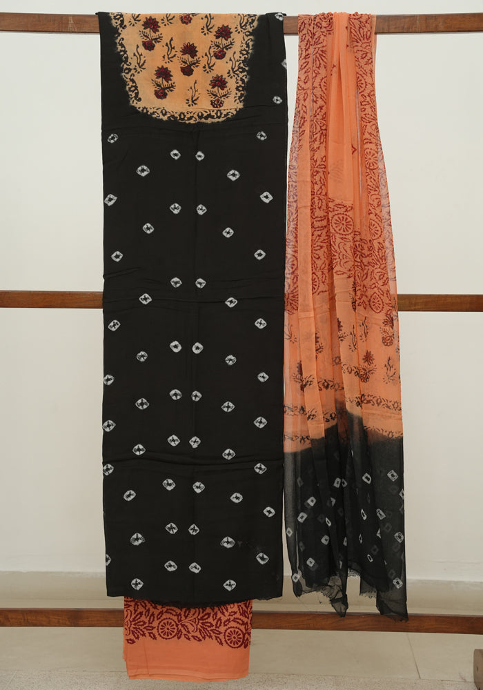 Black and Light Orange Unstitched Block Printed Muslin Salwar Set With Bandini