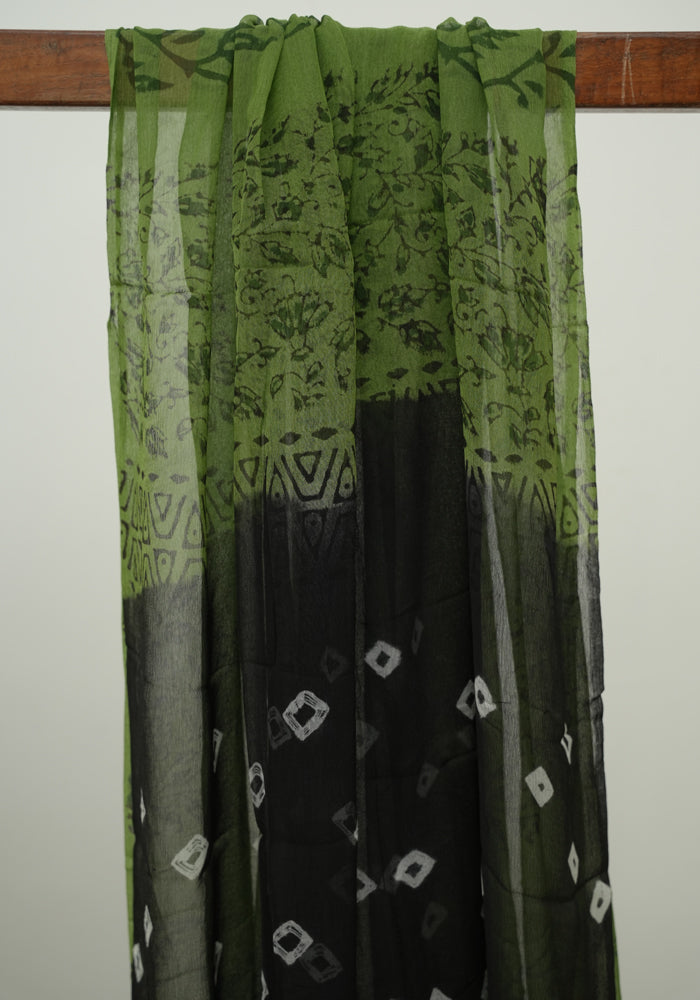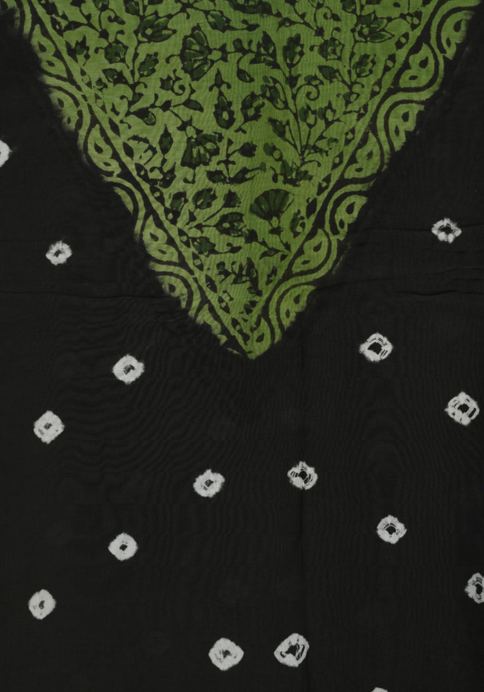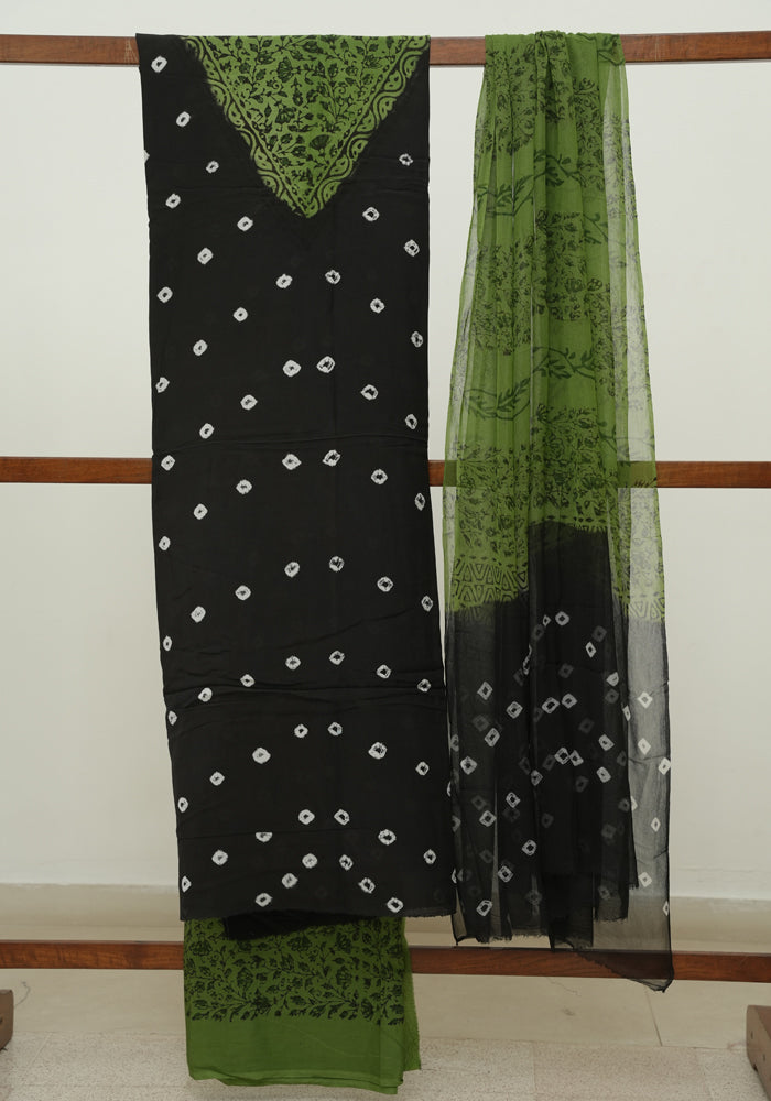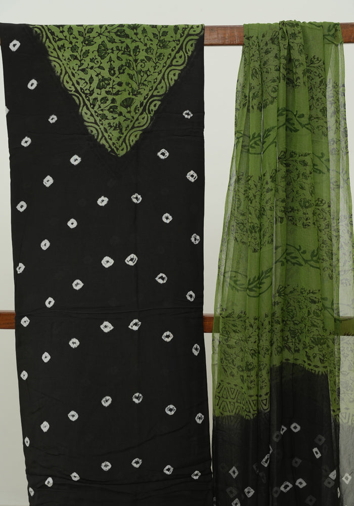 Black and Mehandi Green Unstitched Block Printed Muslin Salwar Set With Bandini