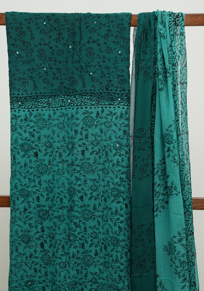 Green and Dark Green Unstitched Georgette Salwar Set with Mirror Work is OUT OF STOCK currently and available on pre-payment only. Order now for delivery within 2 weeks.