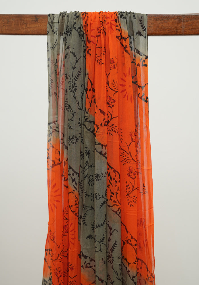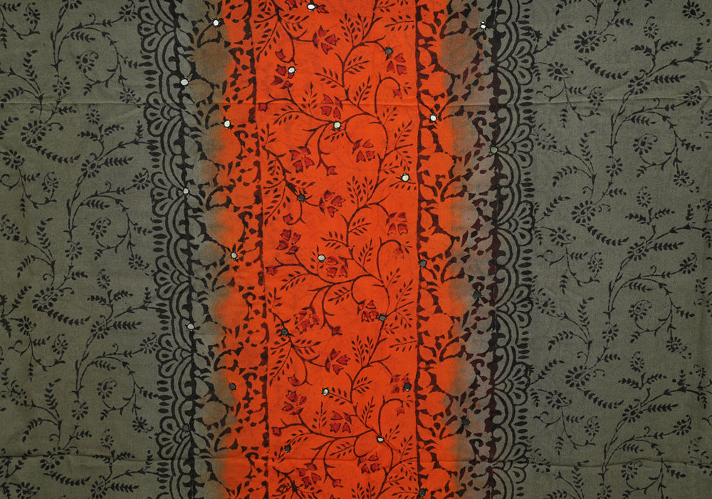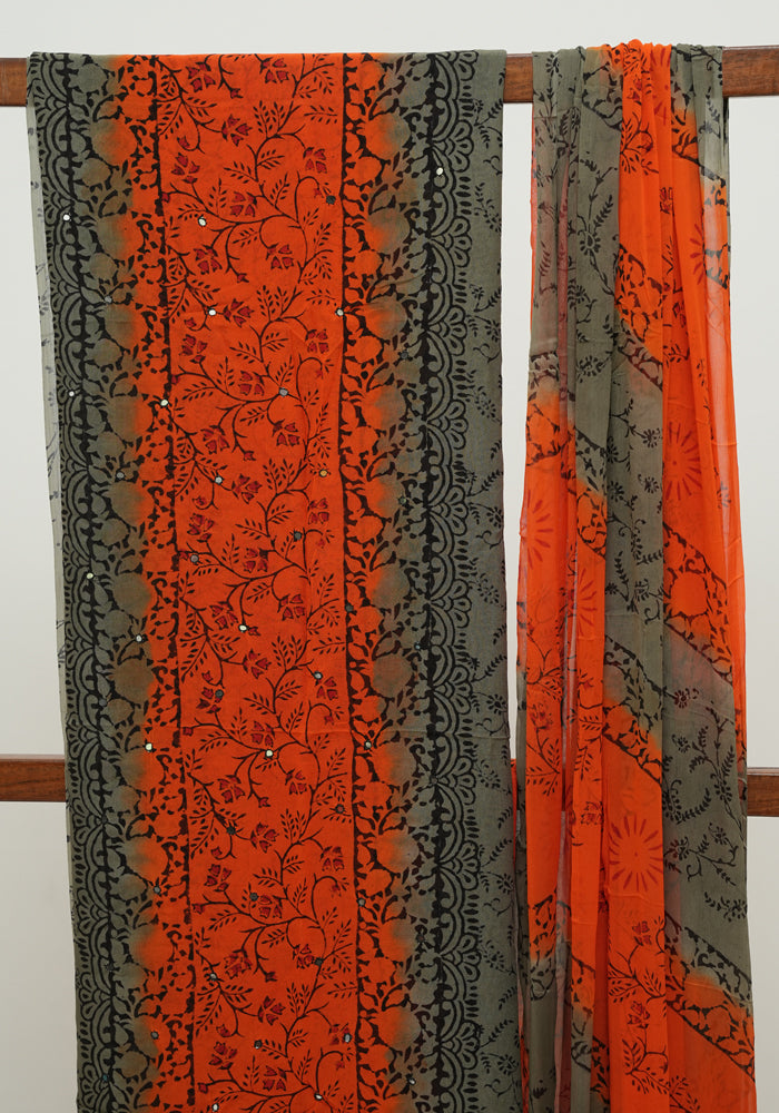 Grey and Orange Unstitched Georgette Salwar Set with Mirror Work is OUT OF STOCK currently and available on pre-payment only. Order now for delivery within 2 weeks.