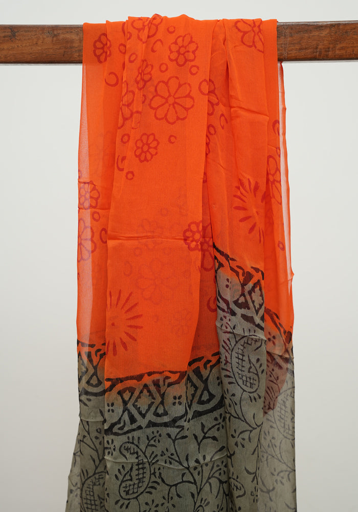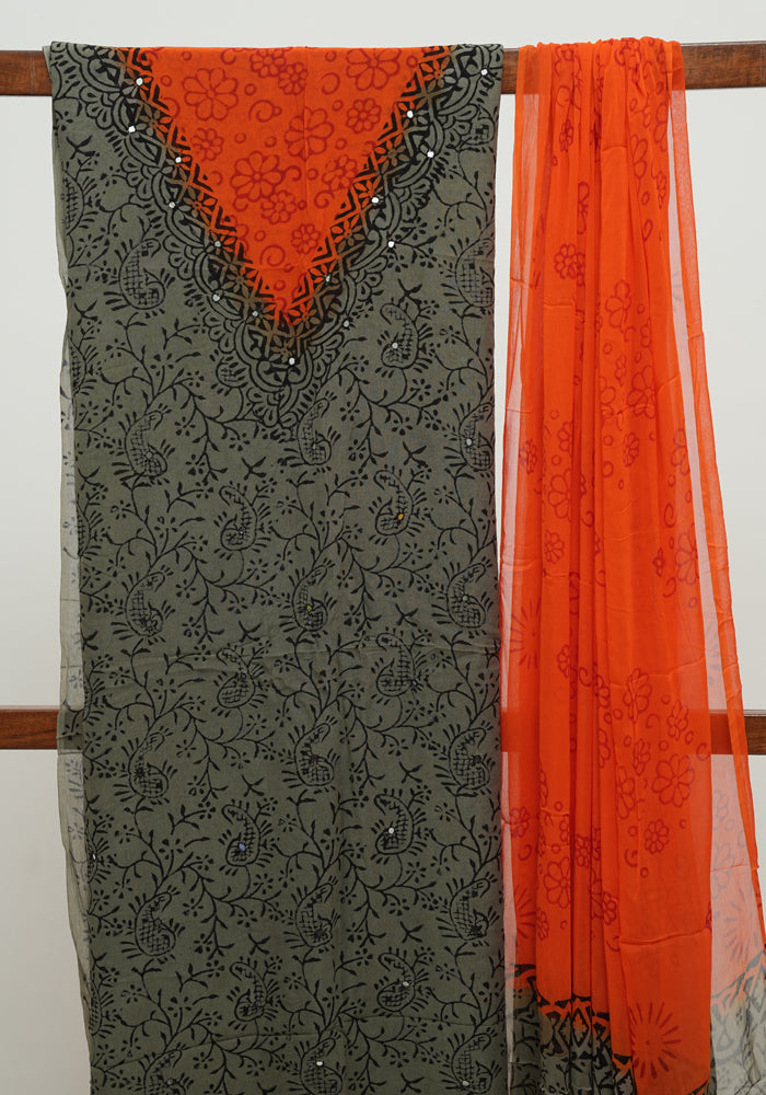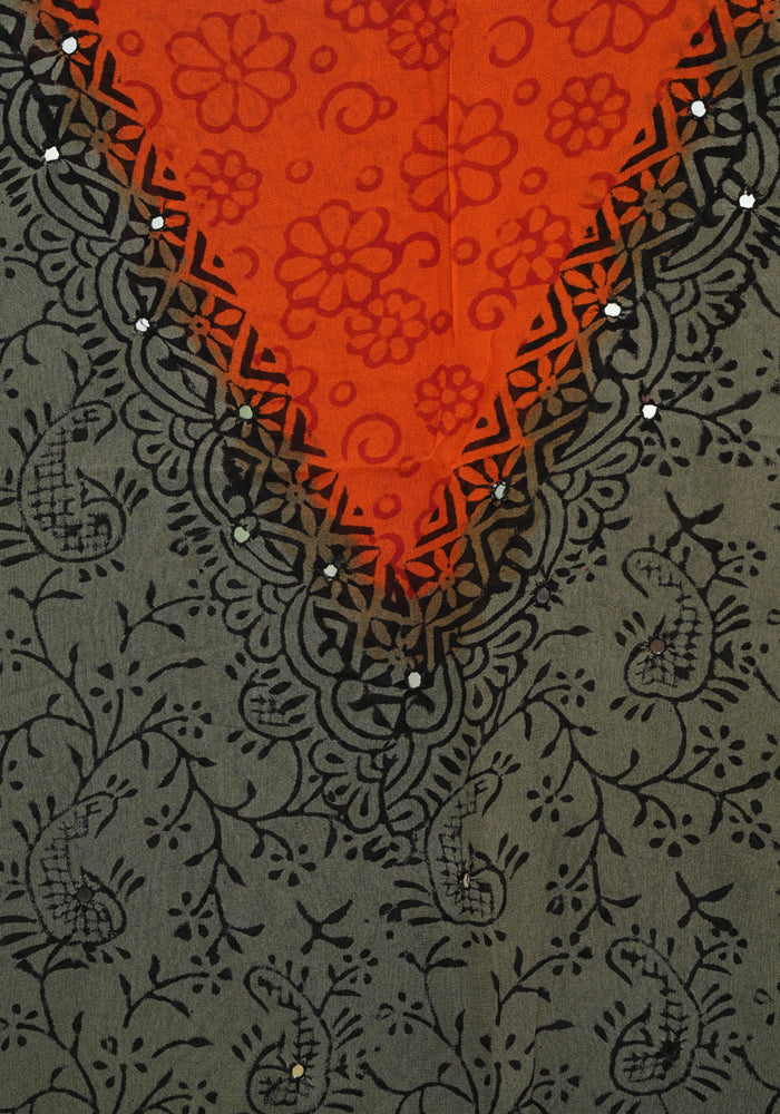 Grey and Orange Unstitched Georgette Salwar Set with Mirror Work is OUT OF STOCK currently and available on pre-payment only. Order now for delivery within 2 weeks.