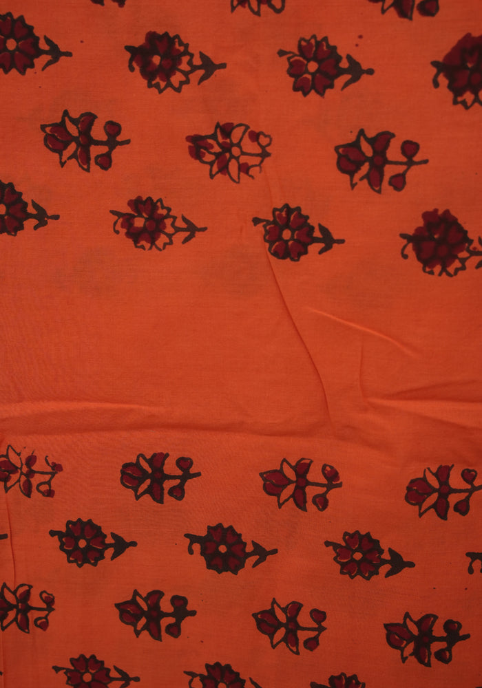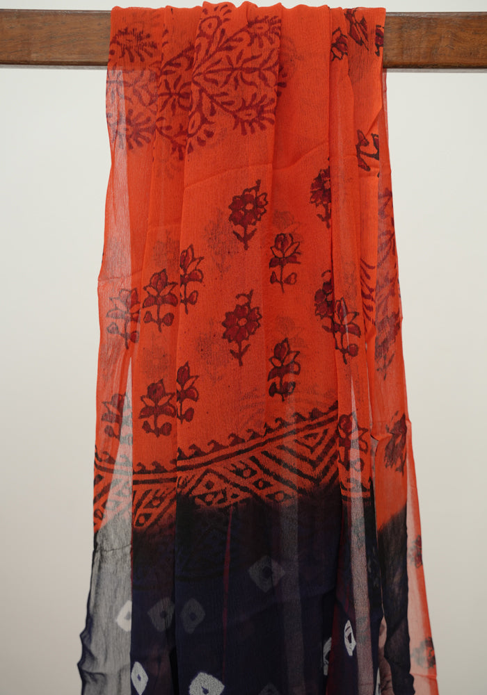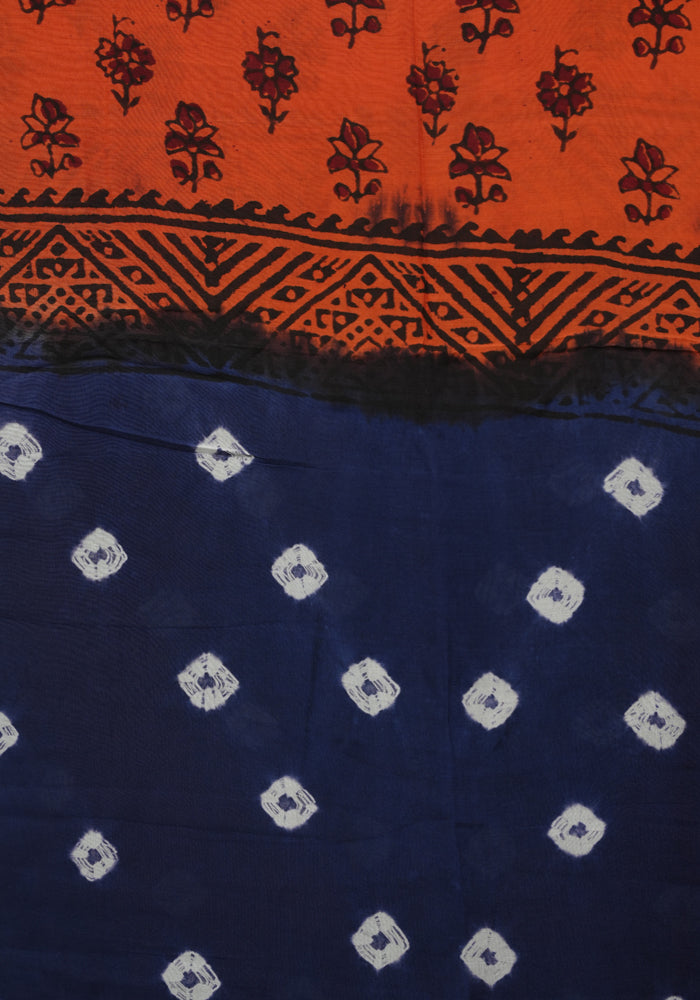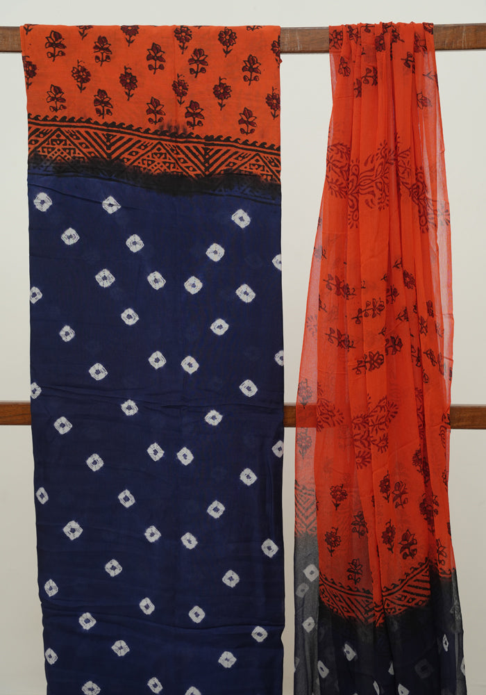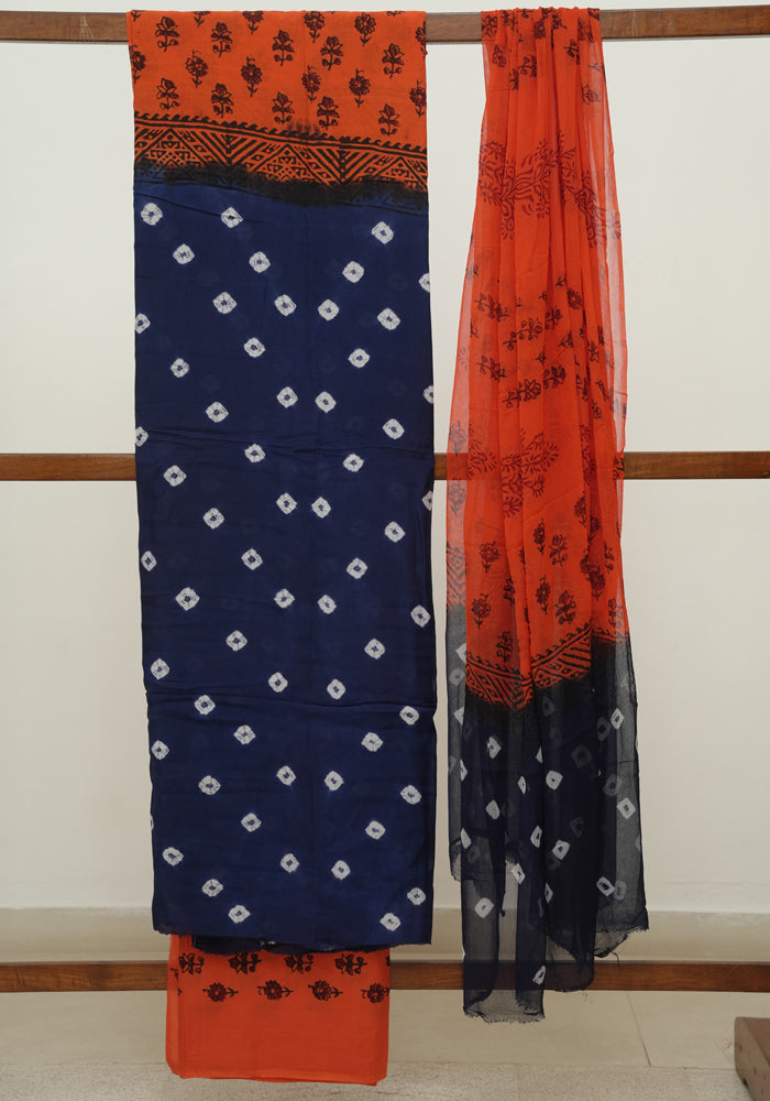 Navy Blue and Orange Unstitched Block Printed Muslin Salwar Set With Bandini