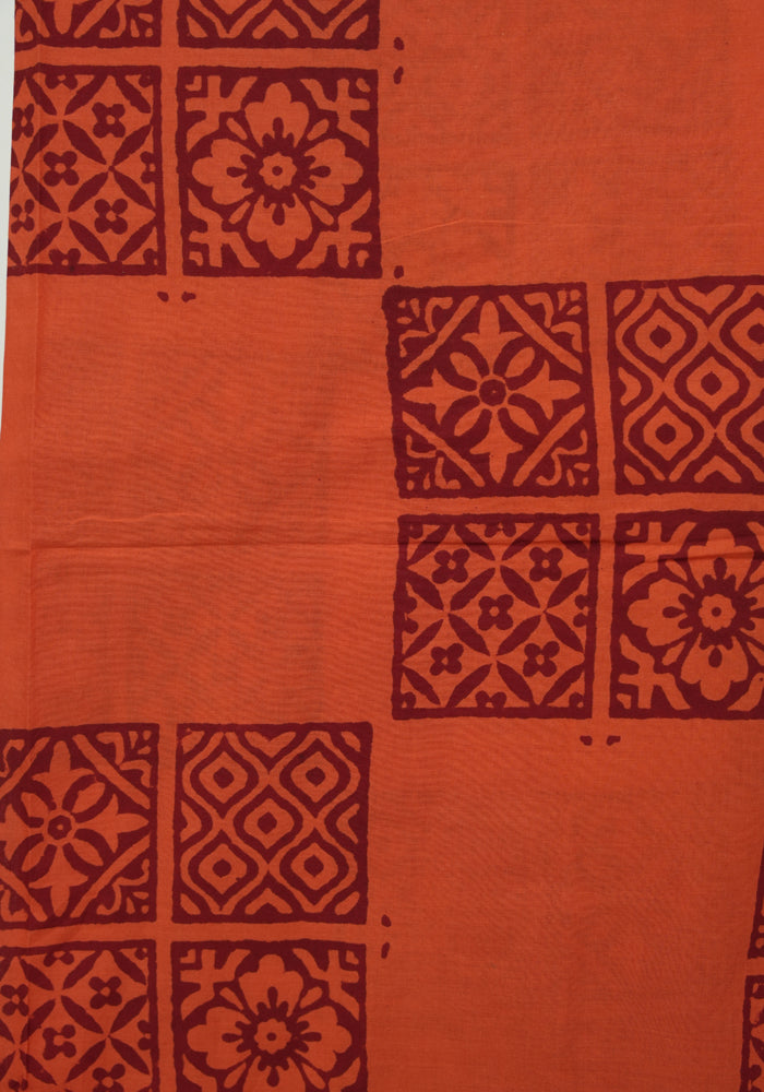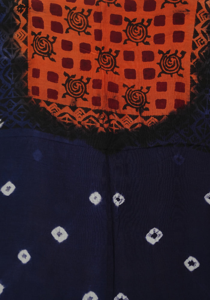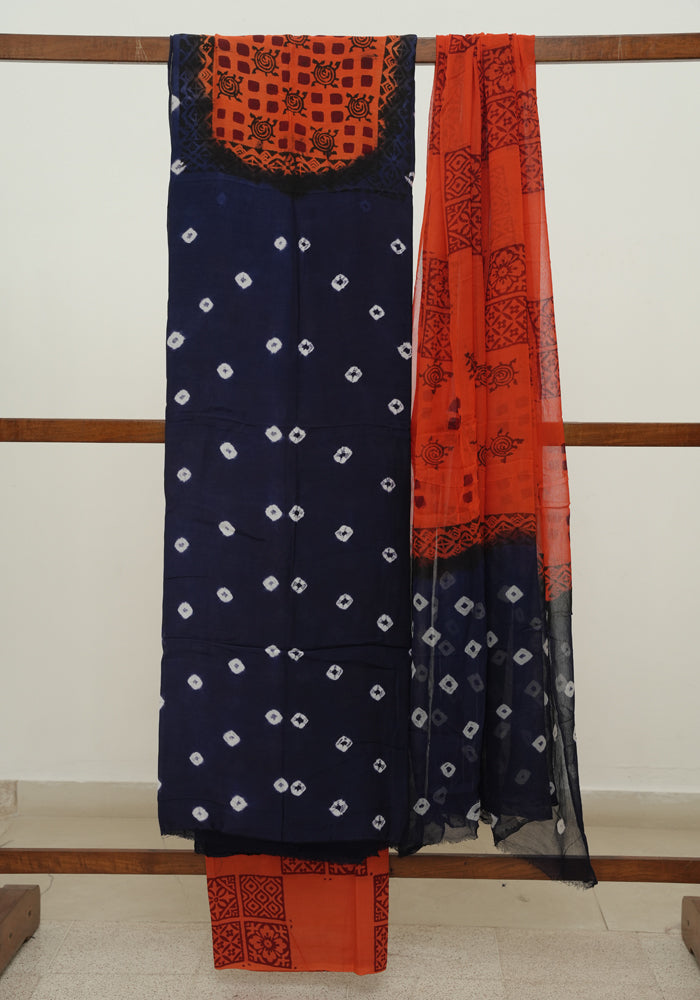 Navy Blue and Orange Unstitched Block Printed Muslin Salwar Set With Bandini