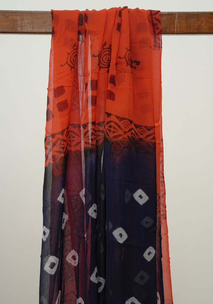 Navy Blue and Orange Unstitched Block Printed Muslin Salwar Set With Bandini is OUT OF STOCK currently and available on pre-payment only. Order now for delivery within 2 weeks.