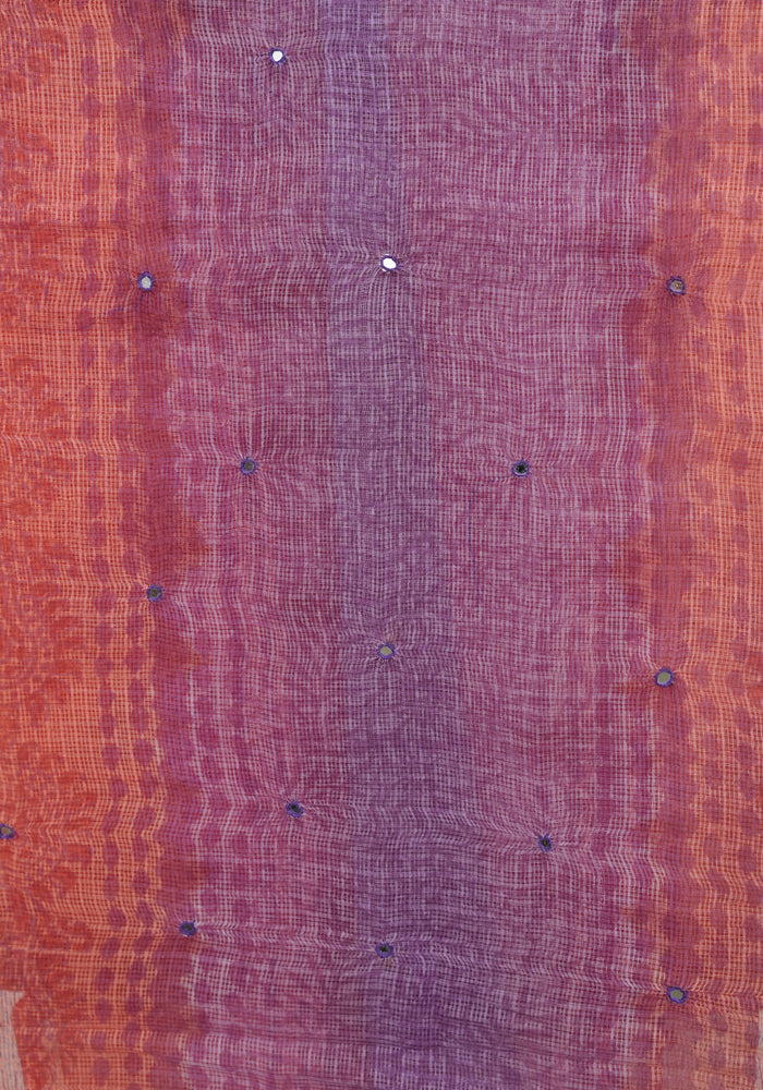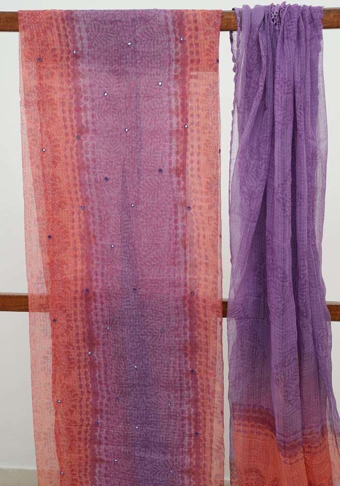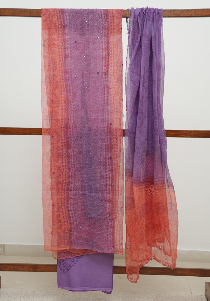 Peach and Light Purple Unstitched Block Printed Kota Salwar Set With Crochet Dupatta