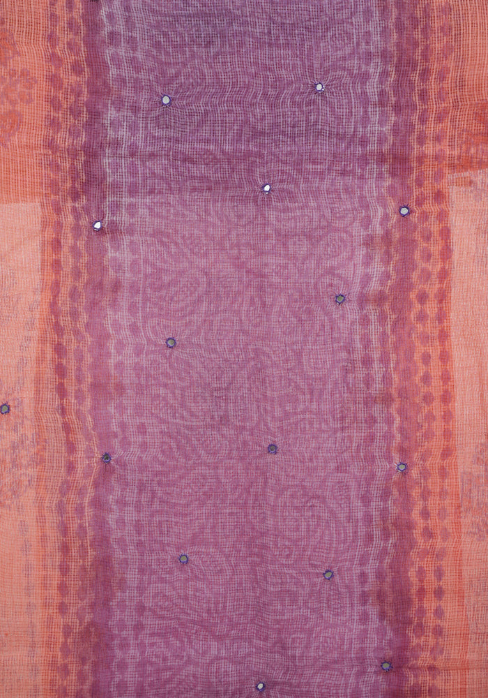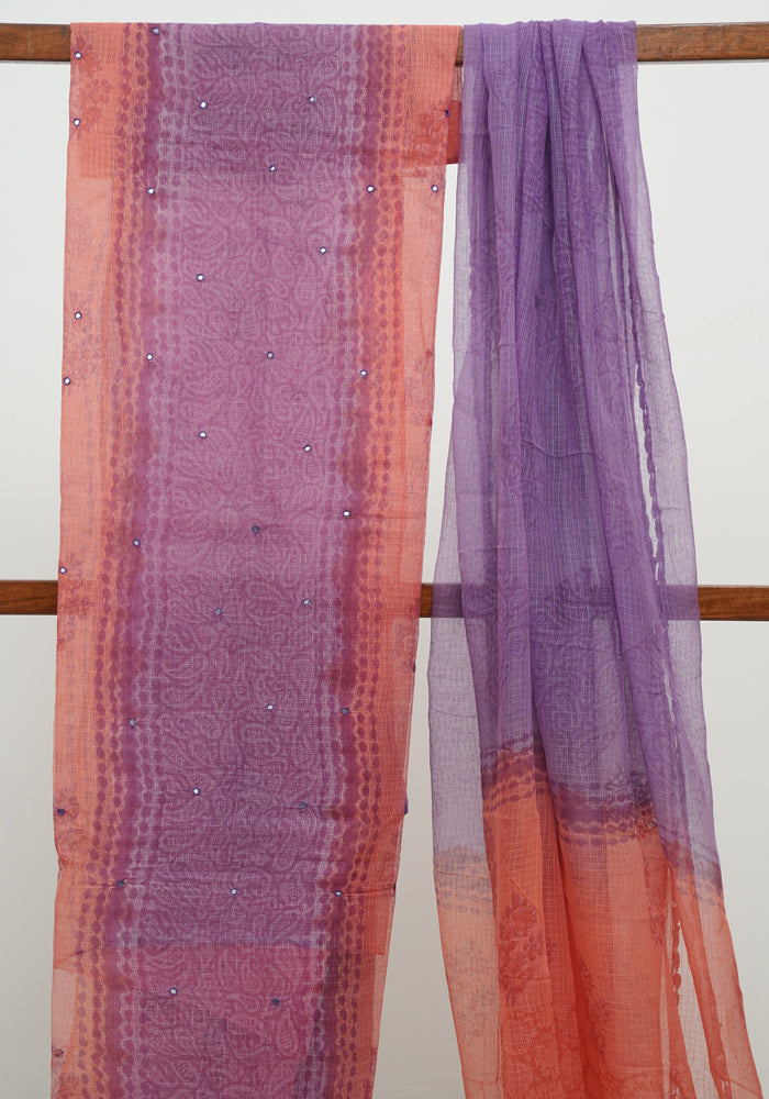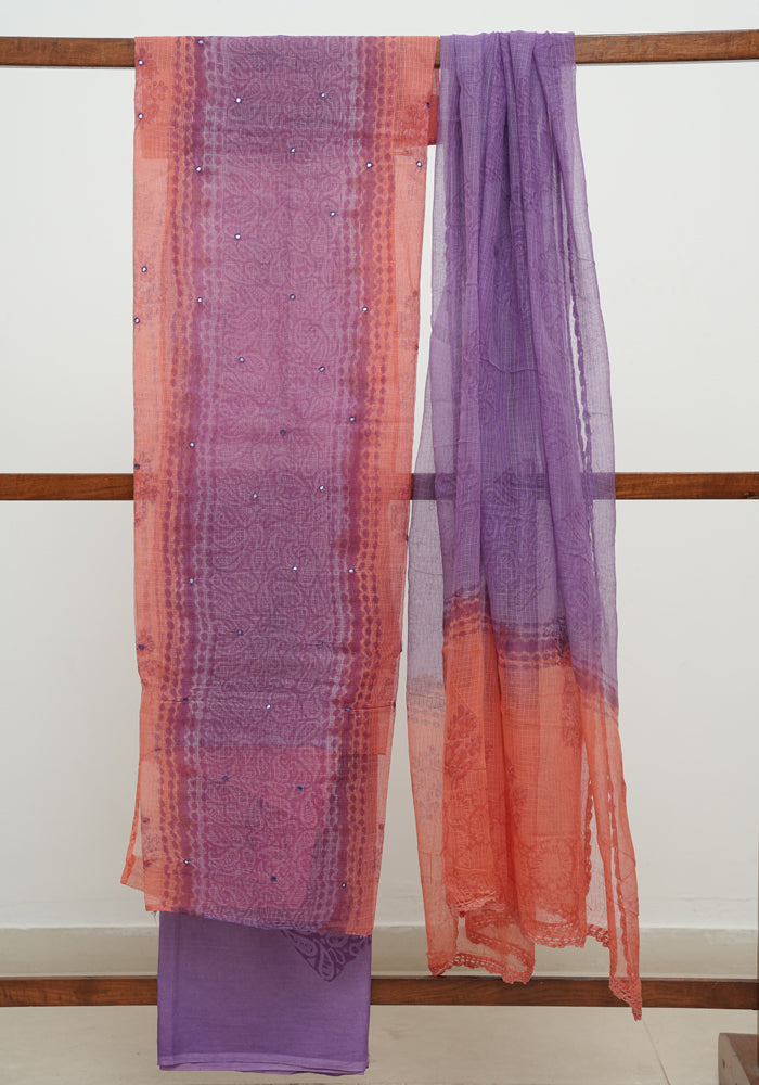 Peach and Purple Unstitched Block Printed Kota Salwar set With Crochet Dupatta