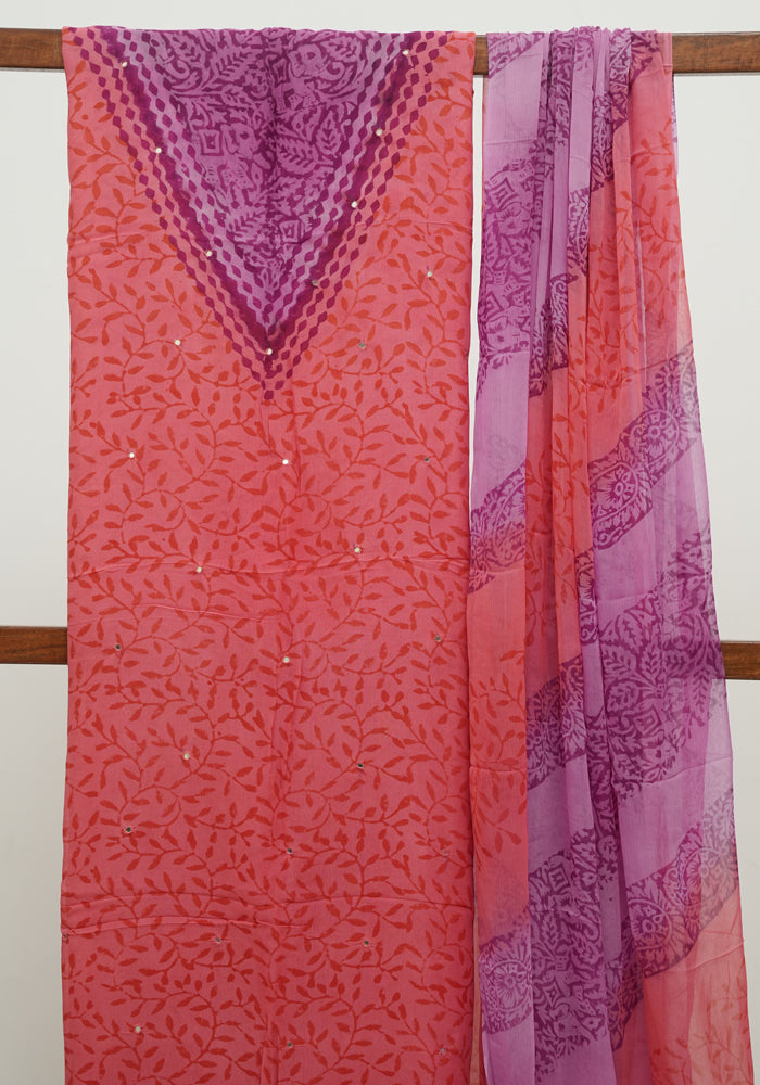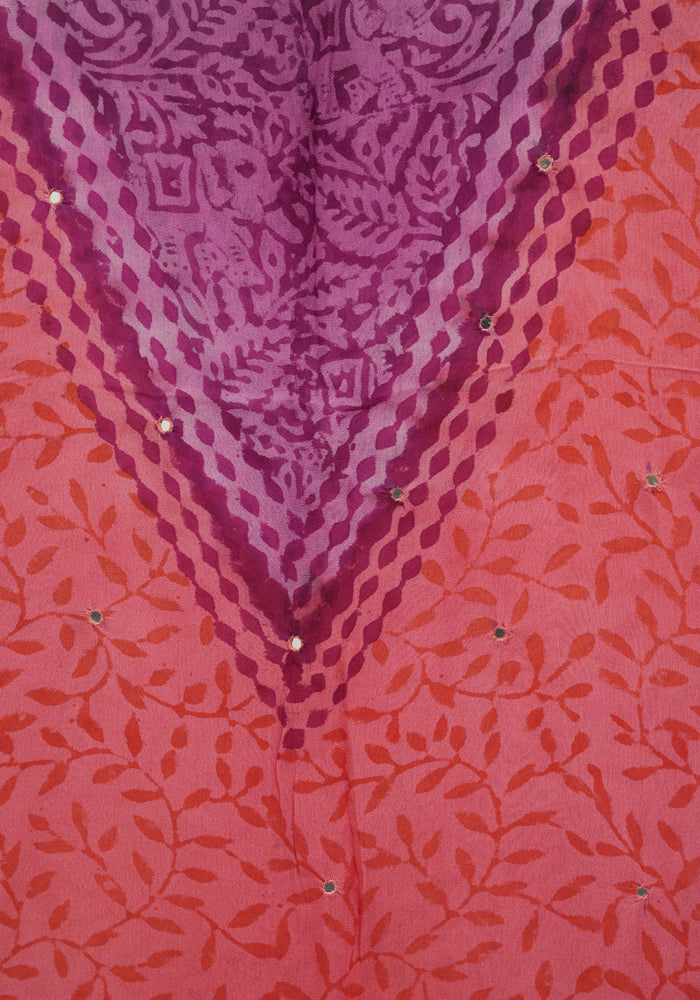Peach and Purple Unstitched Georgette Salwar Set with Mirror Work is OUT OF STOCK currently and available on pre-payment only. Order now for delivery within 2 weeks.
