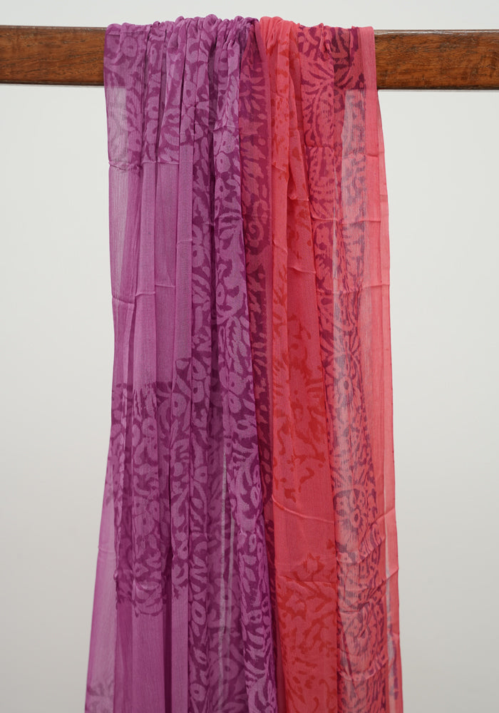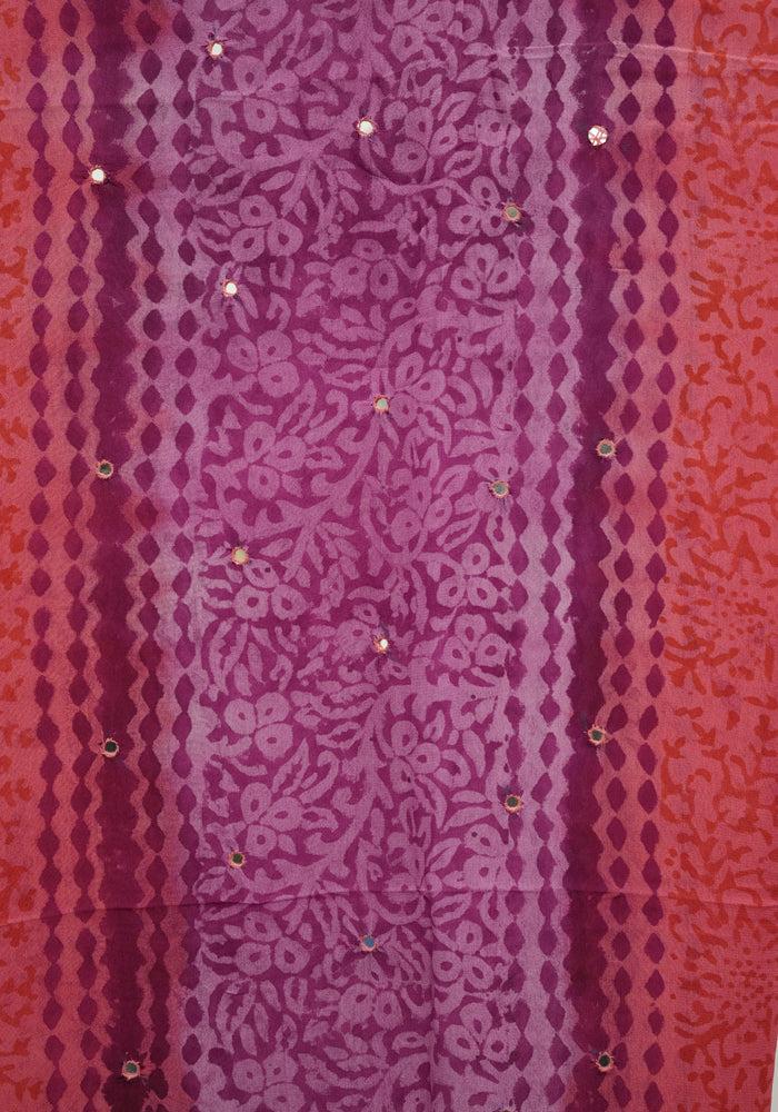 Peach and Purple Unstitched Georgette Salwar Set with Mirror Work is OUT OF STOCK currently and available on pre-payment only. Order now for delivery within 2 weeks.