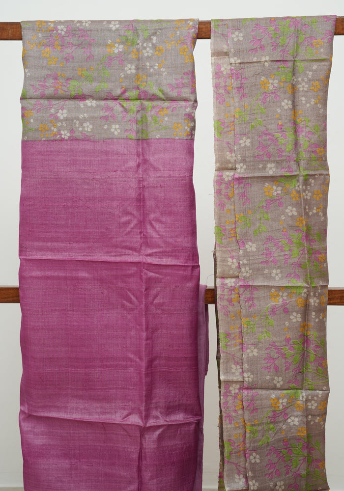 Pink Tussar Silk Unstitched Salwar Set With Digital Print is OUT OF STOCK currently and available on pre-payment only. Order now for delivery within 2 weeks.