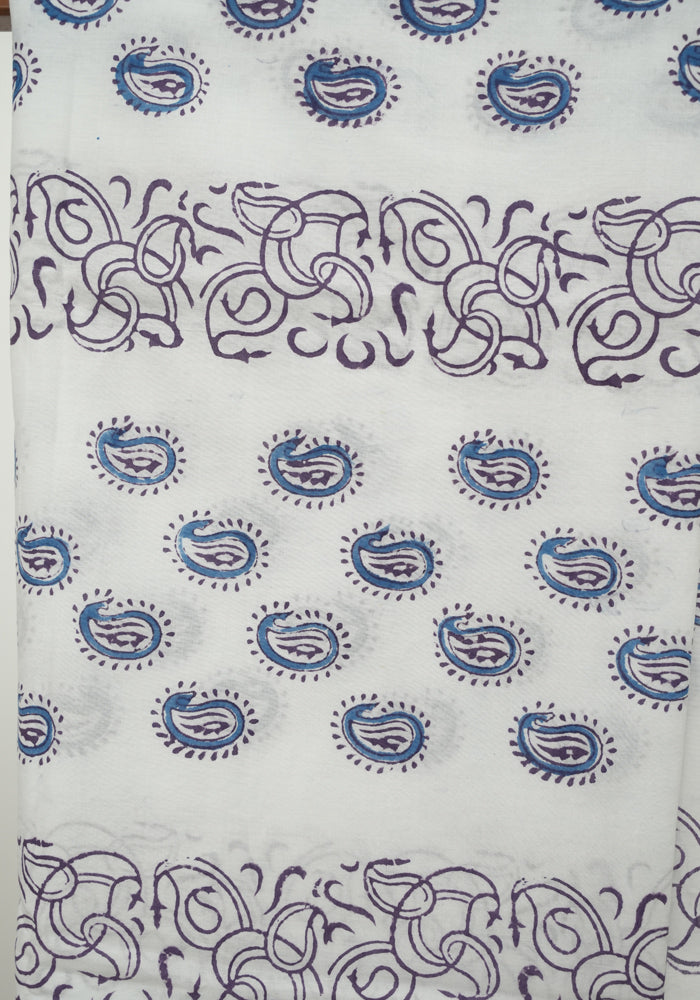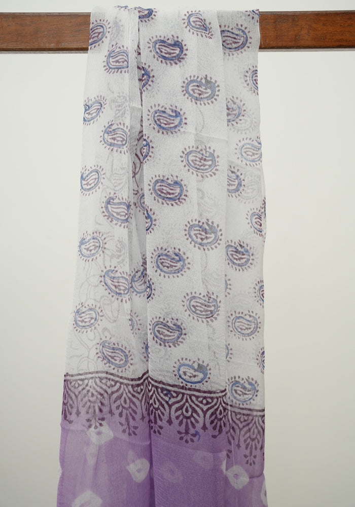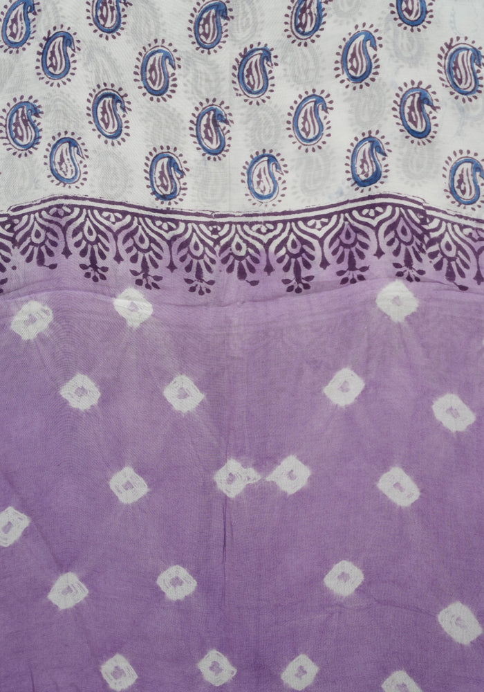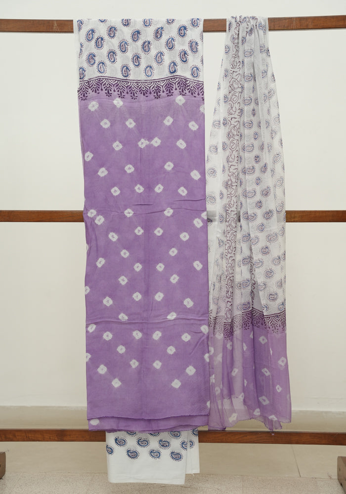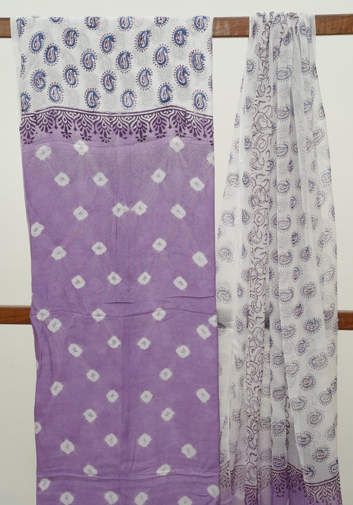 Purple and White Unstitched Block Printed Muslin Salwar Set With Bandini