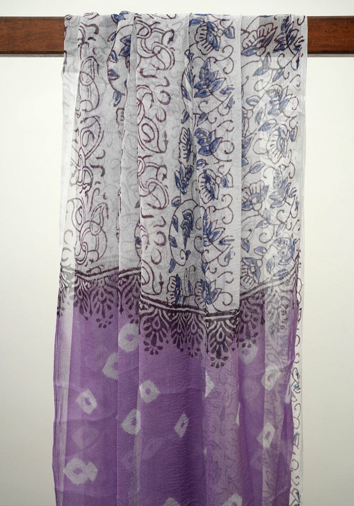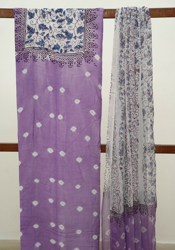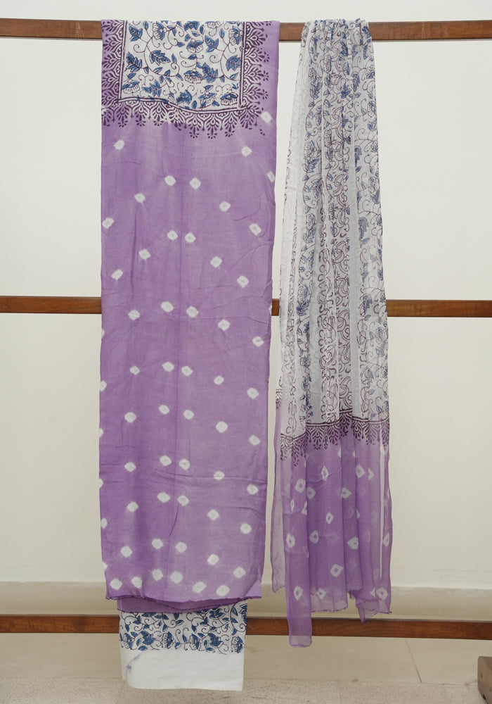 Purple and White Unstitched Block Printed Muslin Salwar Set With Bandini