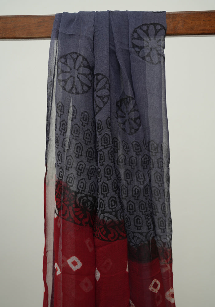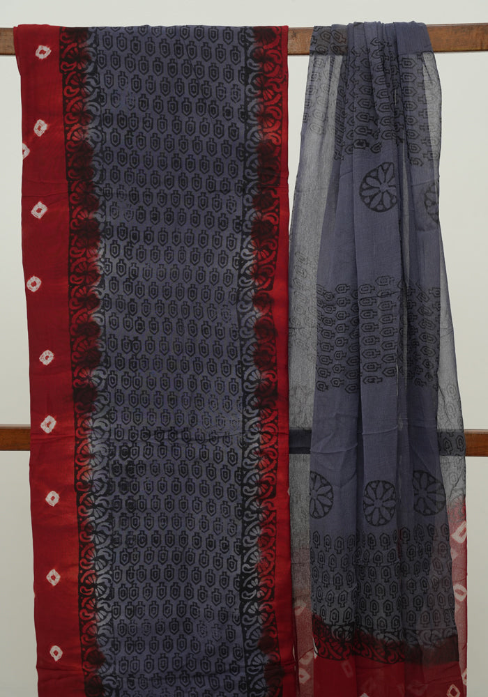Red and Grey Unstitched Block Printed Muslin Salwar Set With Bandini