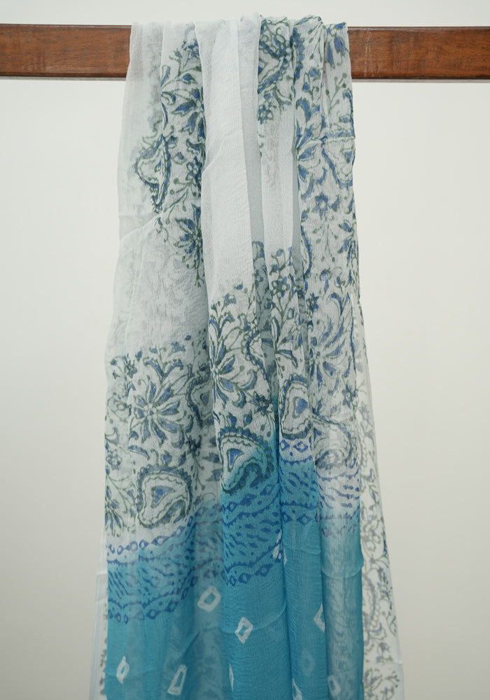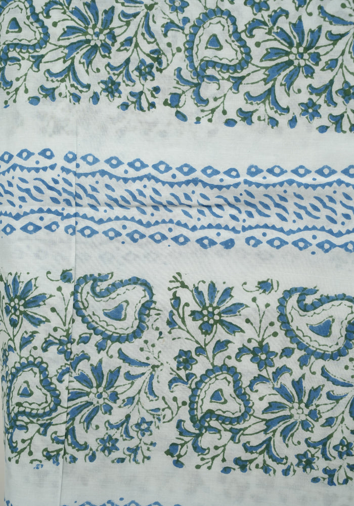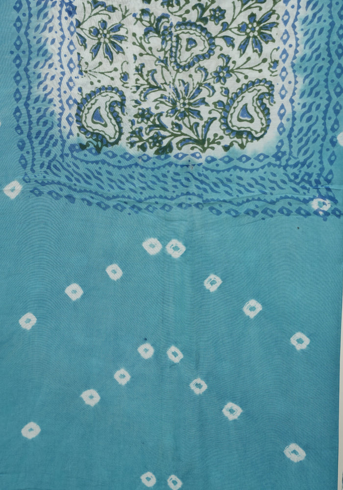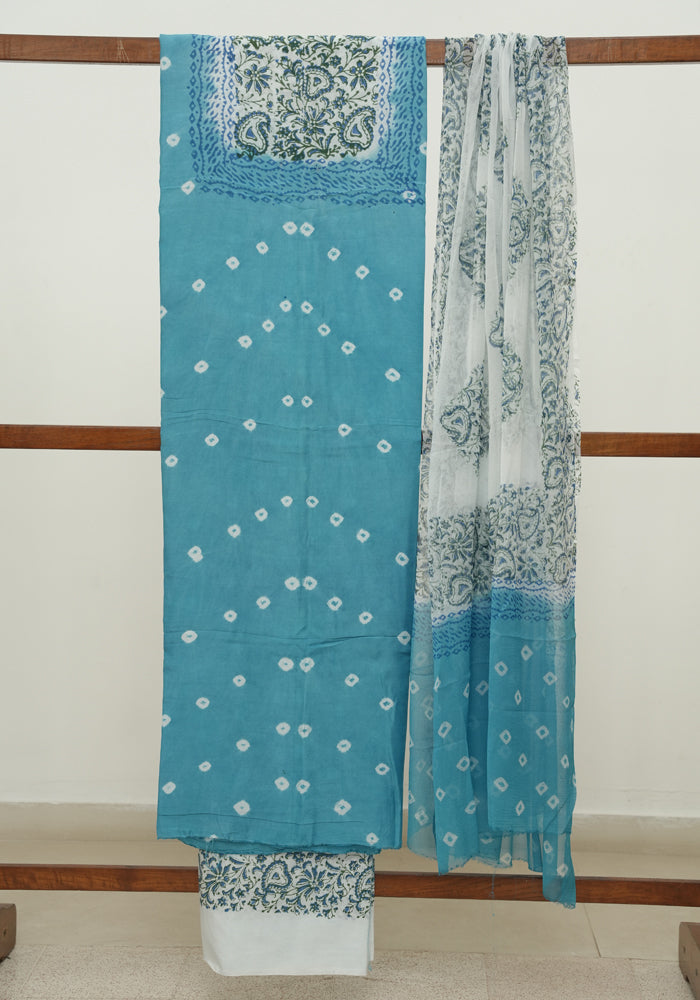 Sky Blue and White Unstitched Block Printed Muslin Salwar Set With Bandini