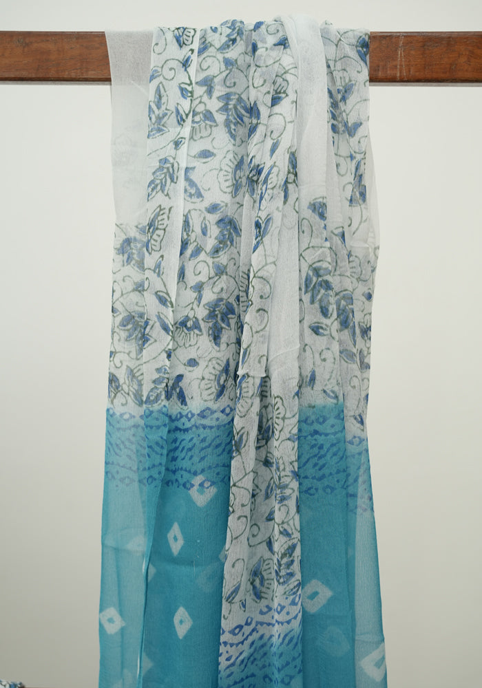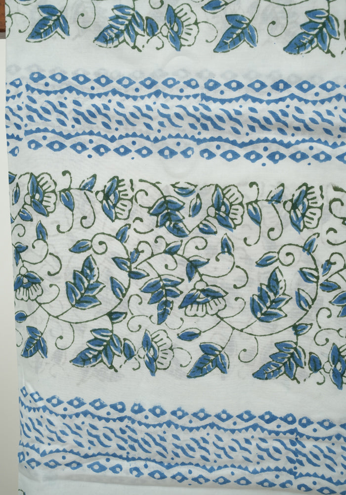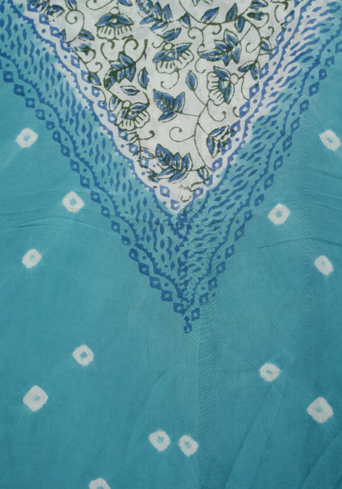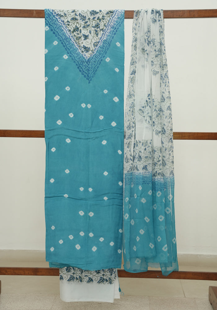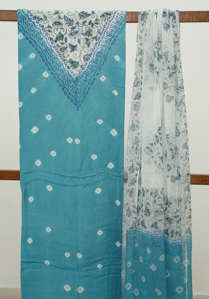 Sky Blue and White Unstitched Block Printed Muslin Salwar Set With Bandini