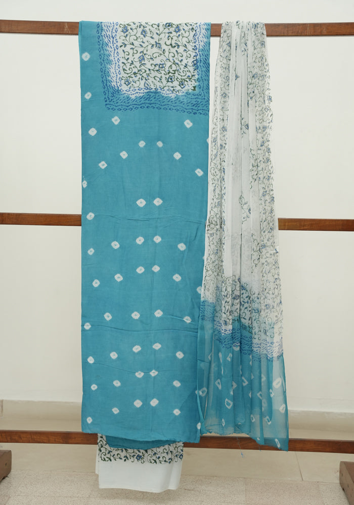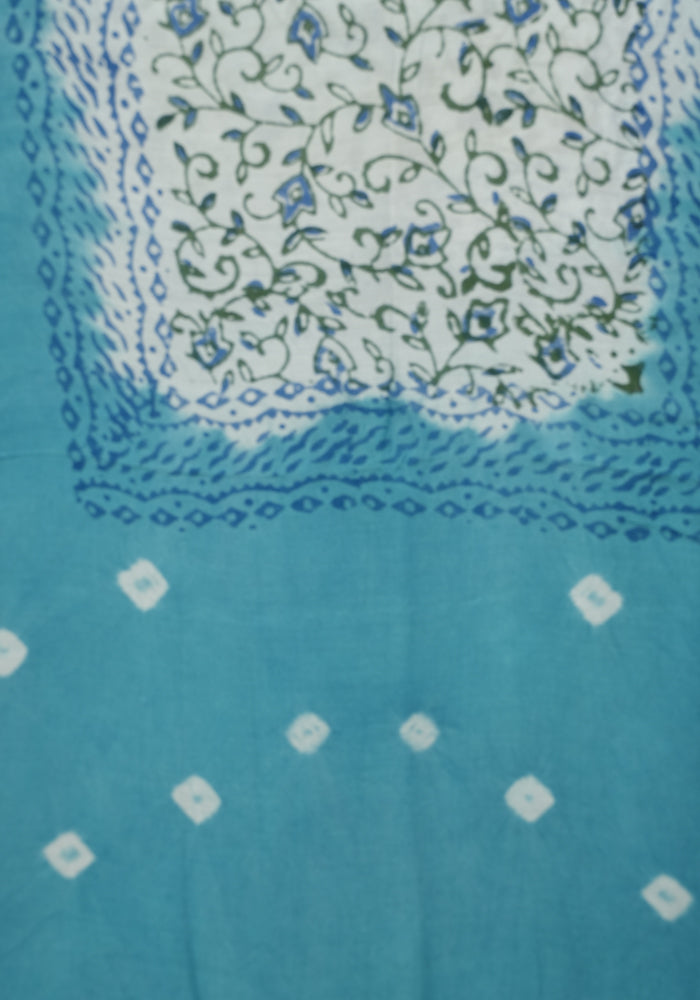 Sky Blue and White Unstitched Block Printed Muslin Salwar Set With Bandini is OUT OF STOCK currently and available on pre-payment only. Order now for delivery within 2 weeks.