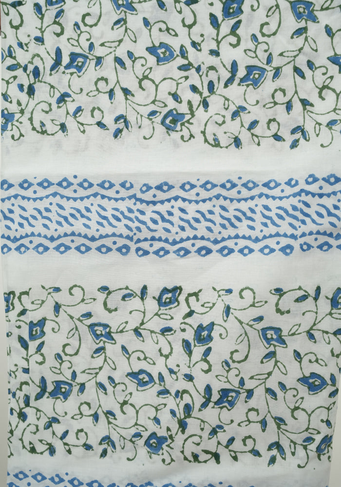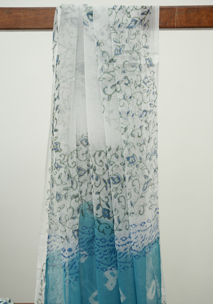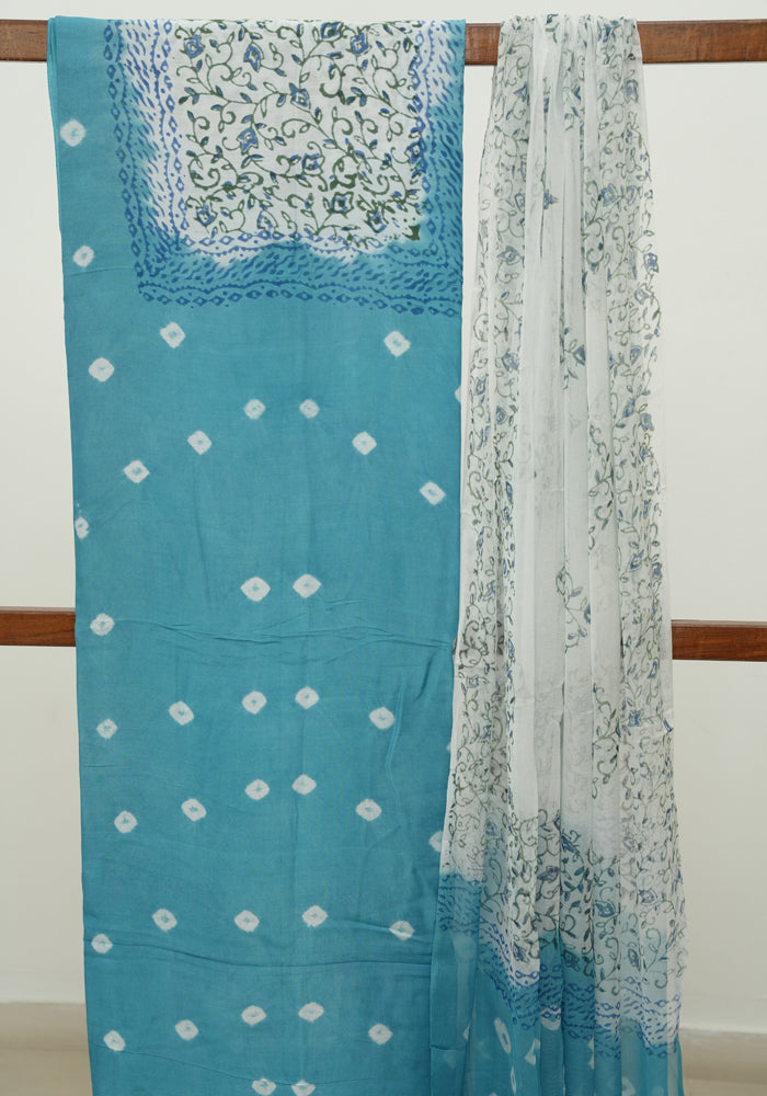 Sky Blue and White Unstitched Block Printed Muslin Salwar Set With Bandini