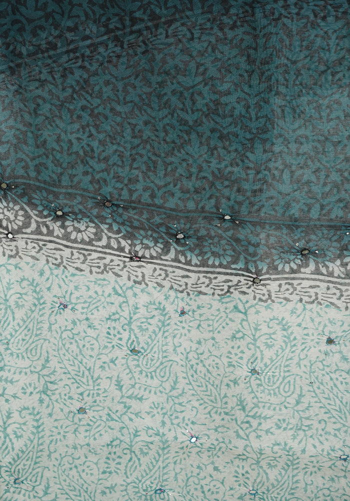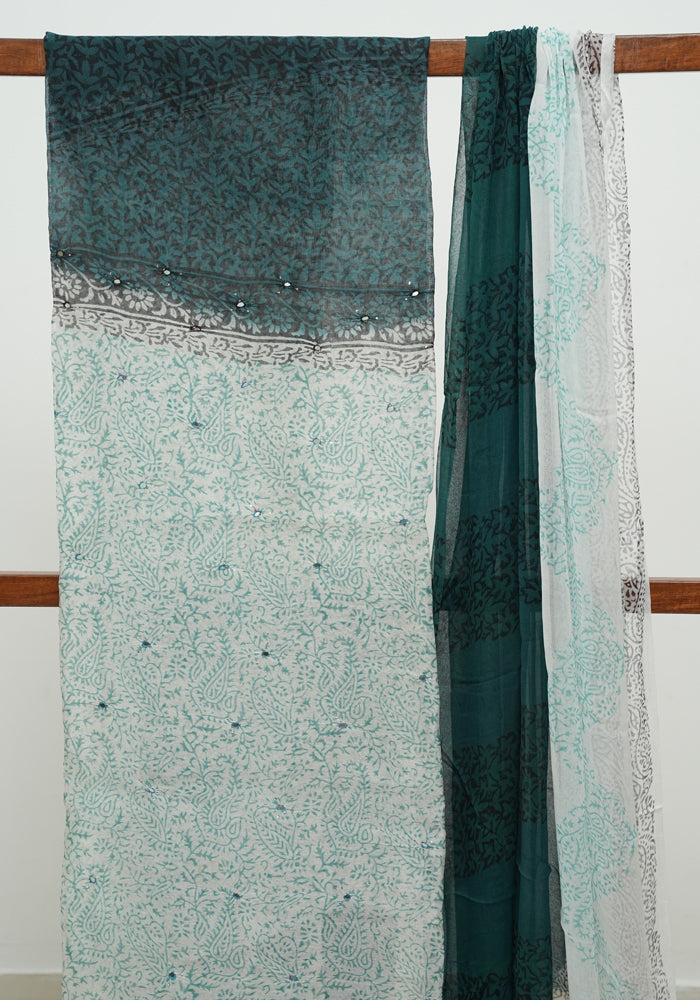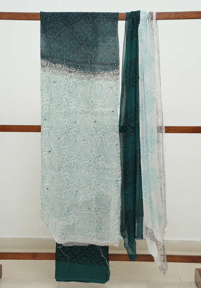 White and Teal Green Unstitched Super Net Salwar Set With Mirror Work