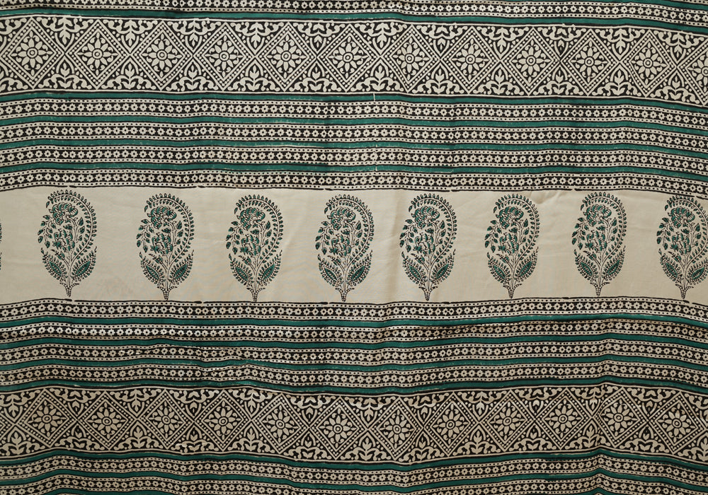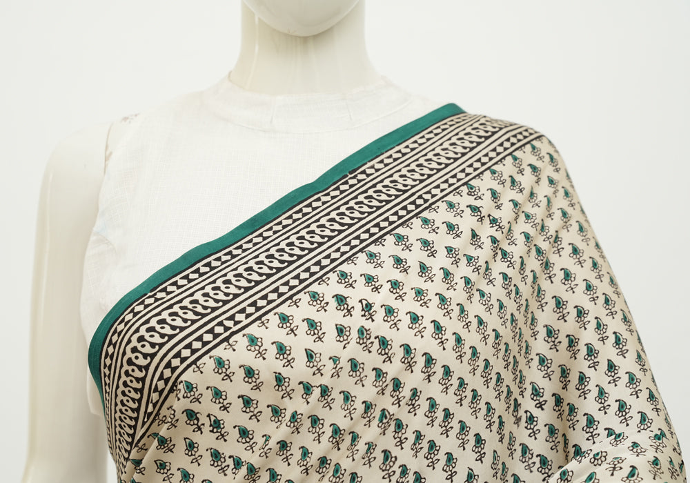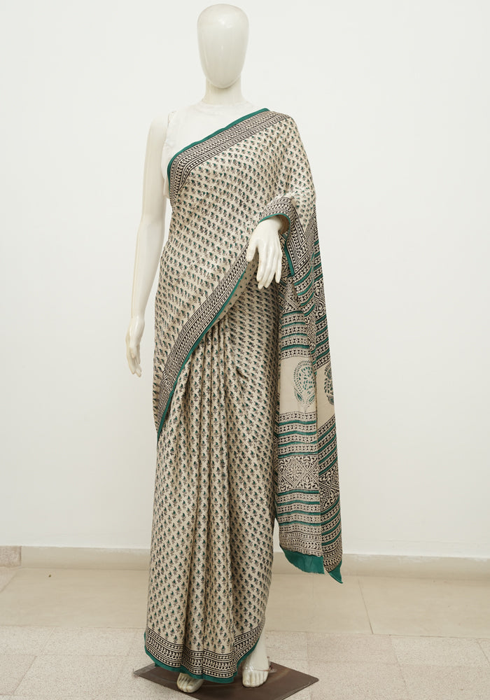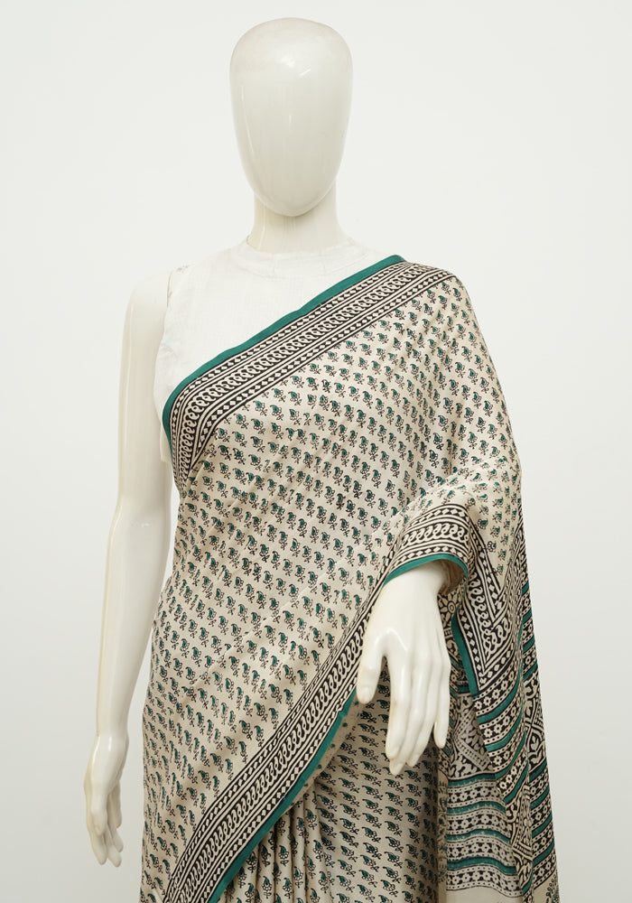 Beige and Green Block Printed Modal Silk saree