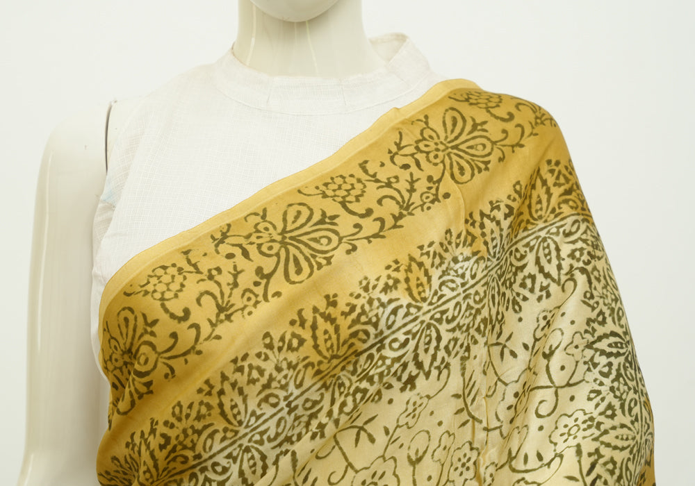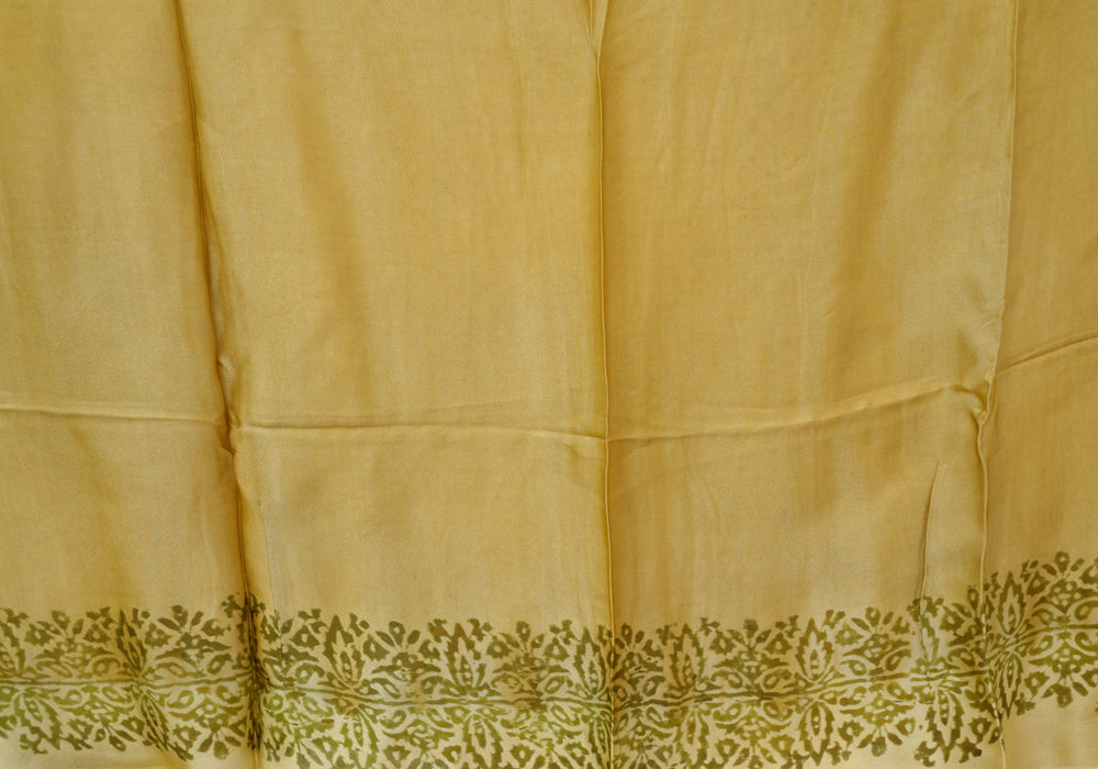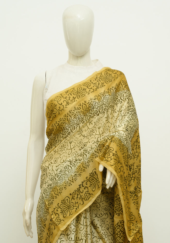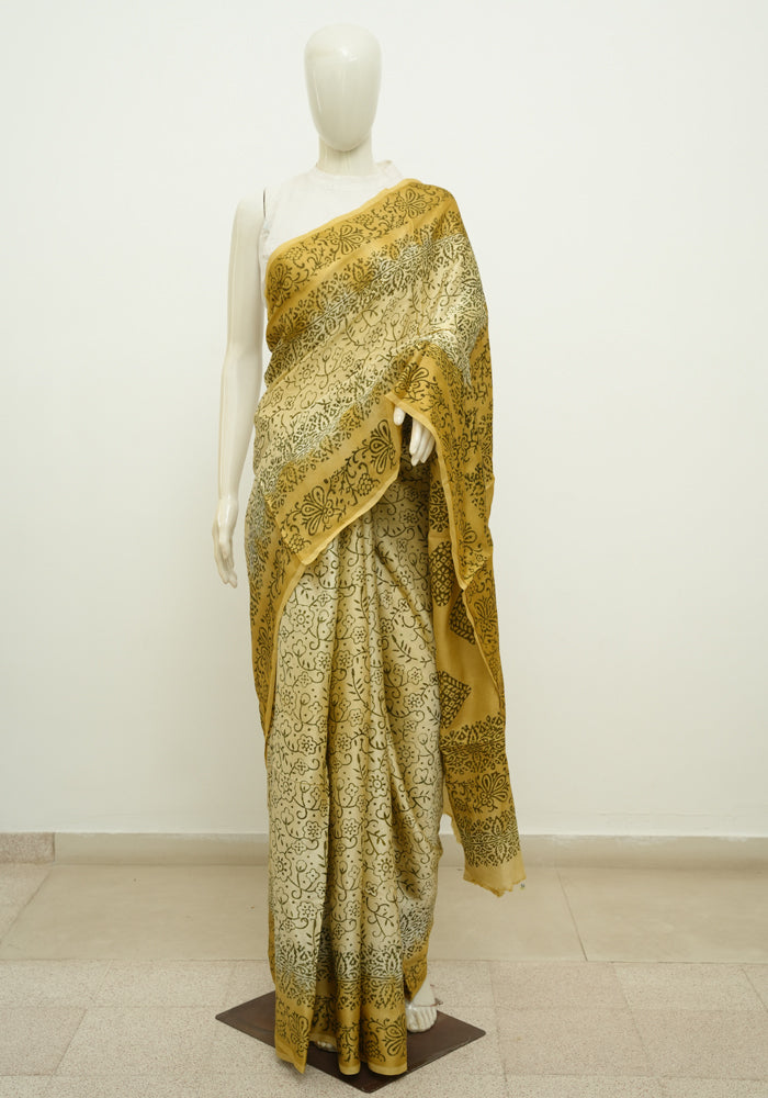 Beige and Light Brown Block Printed Modal Silk saree