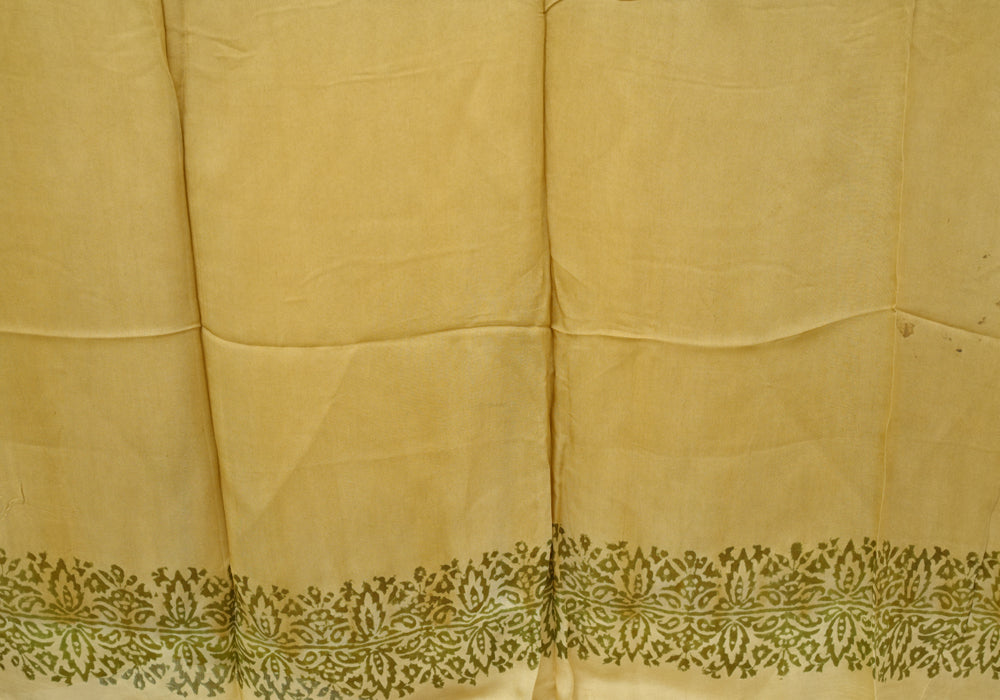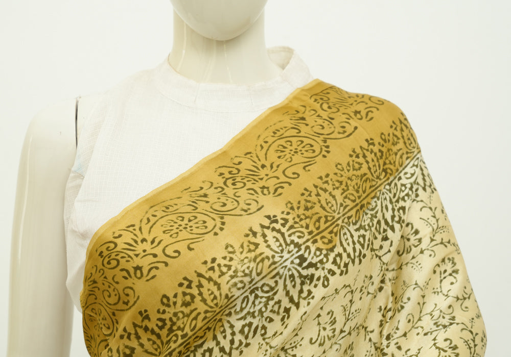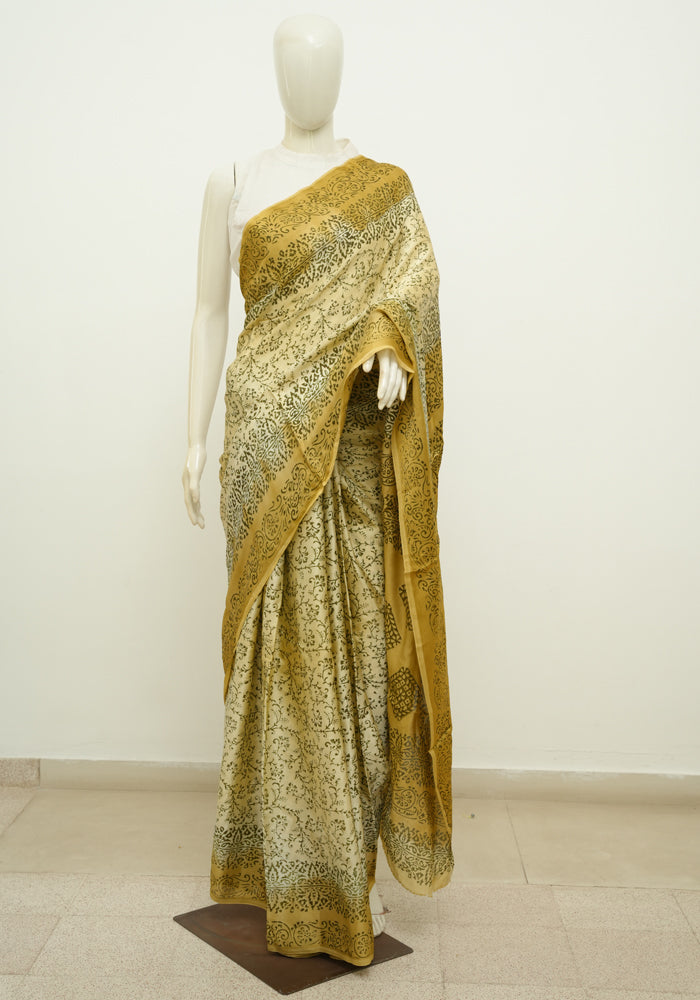 Beige and Light Brown Block Printed Modal Silk saree
