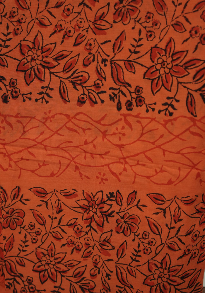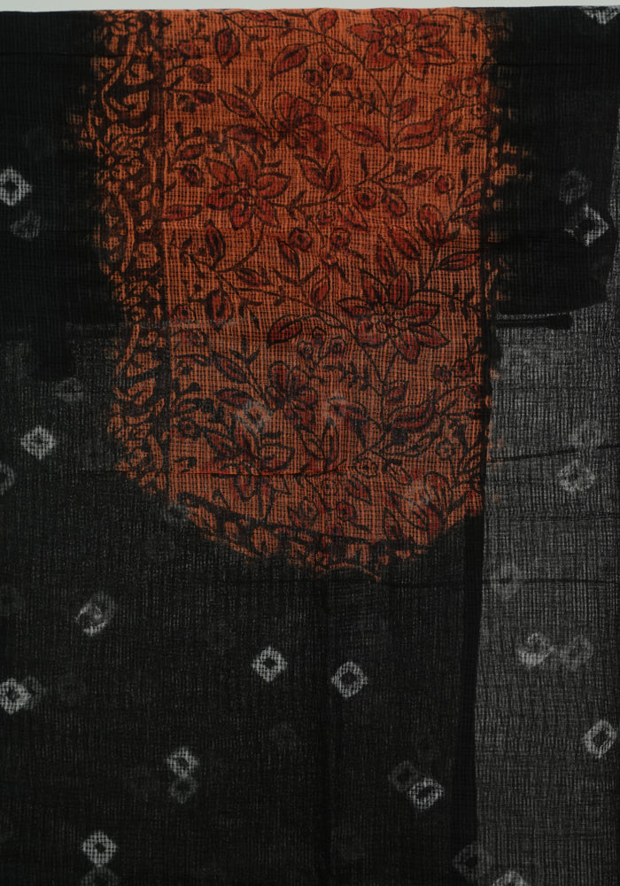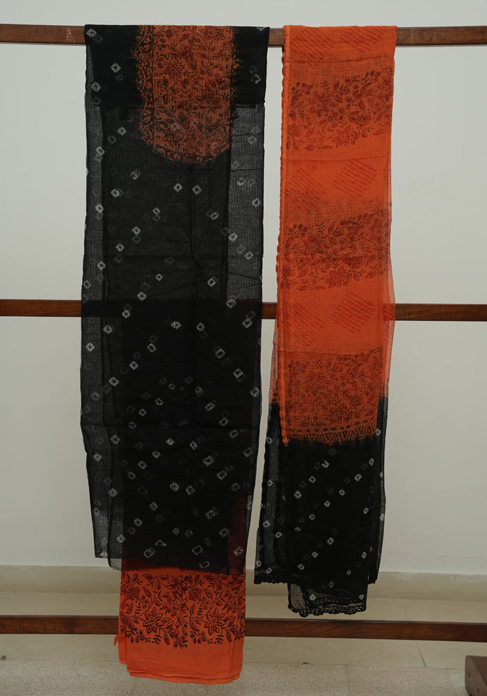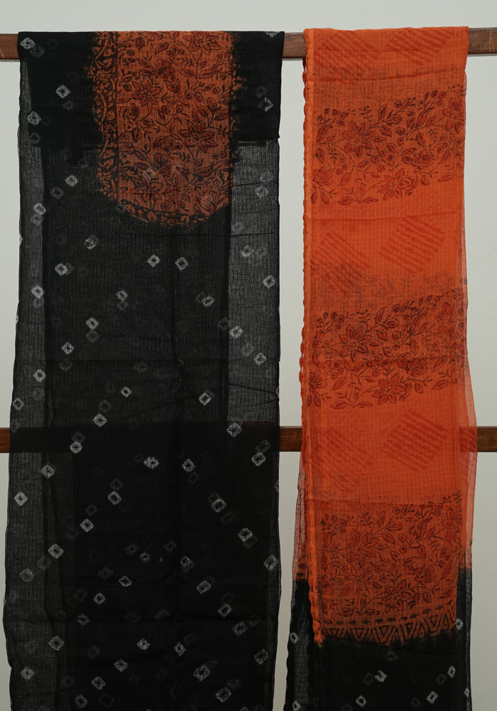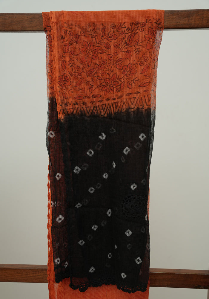 Black and Orange Unstitched Block Printed Kota Salwar Set With Bandini and Crochet Dupatta