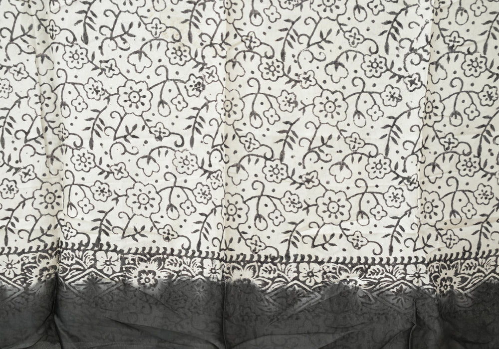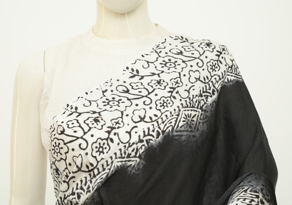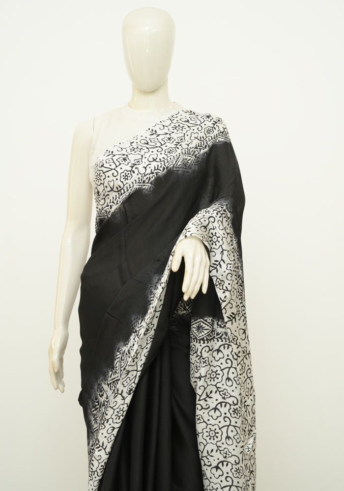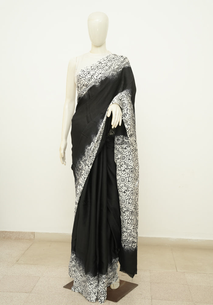 Black and White Block Printed Modal Silk saree