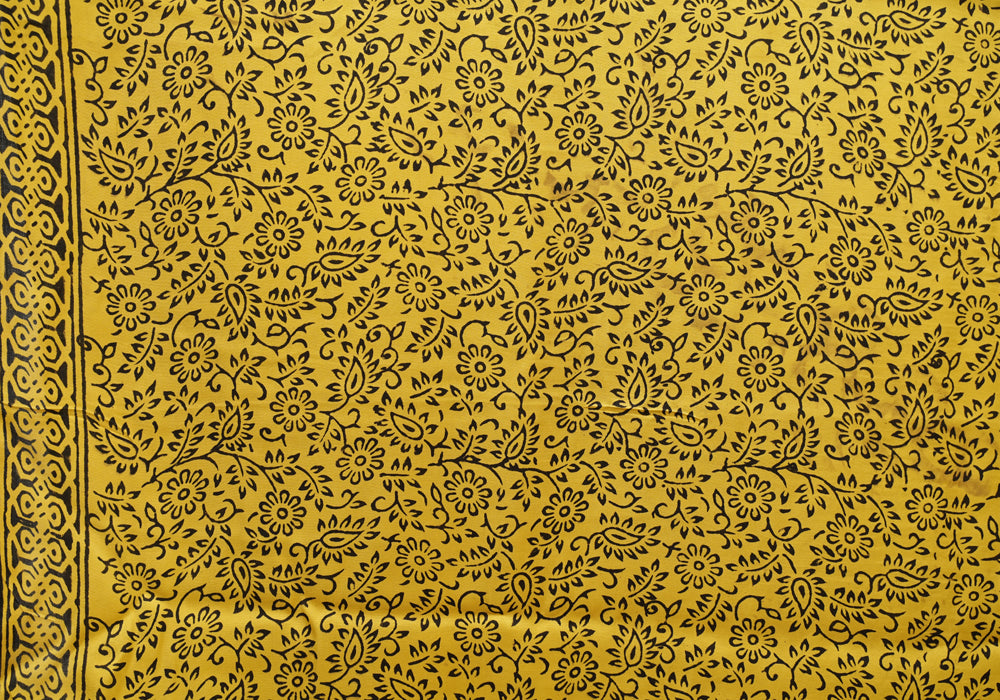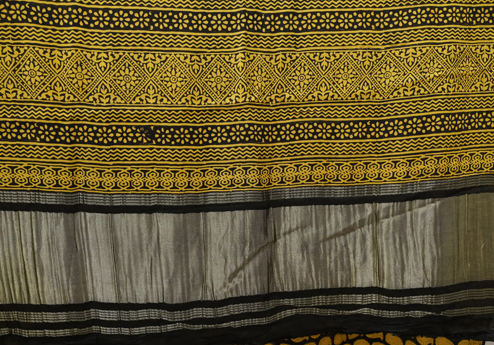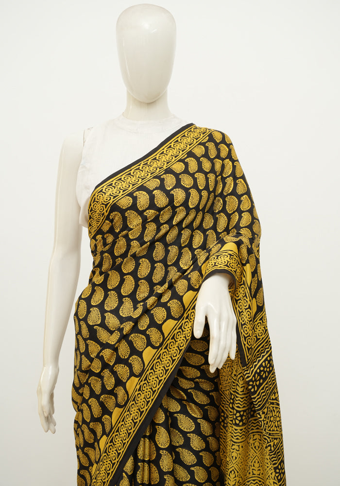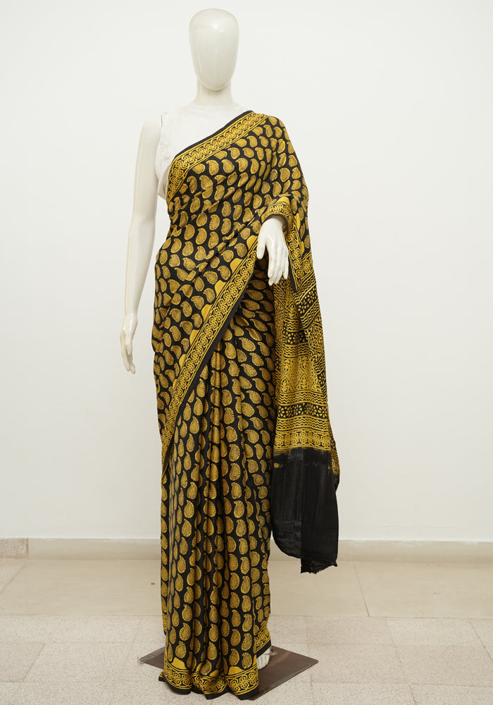 Black and Yellow Block Printed Modal Silk saree