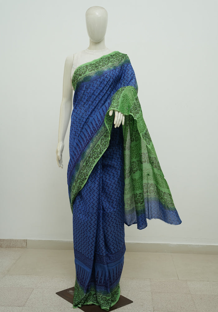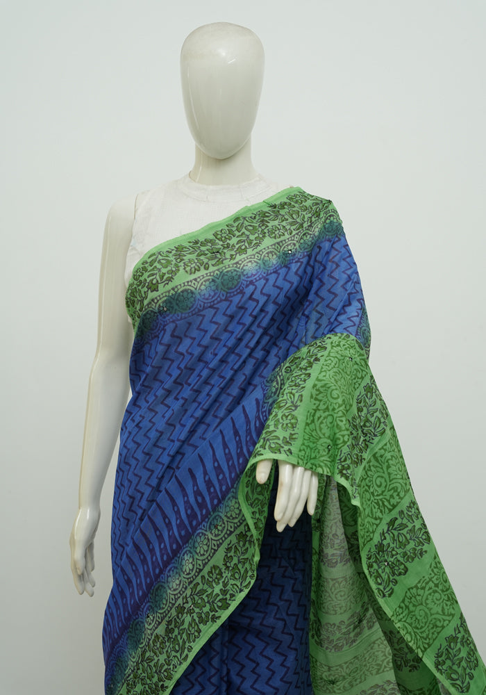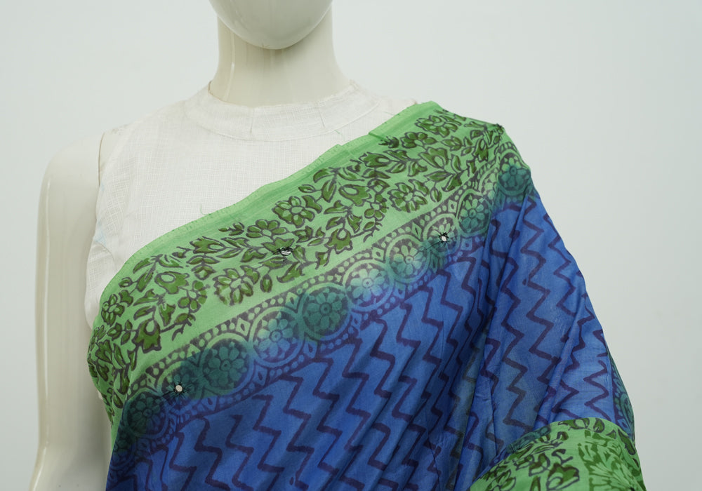 Blue and Parrot Green Block Printed Chennur Silk Saree with Mirror Work