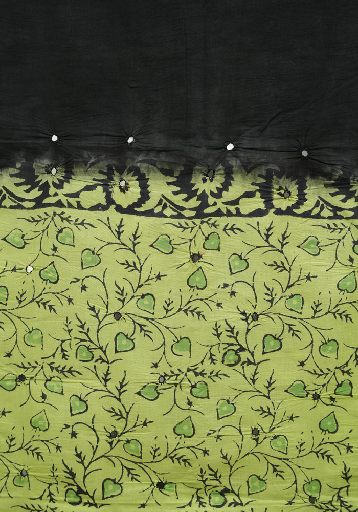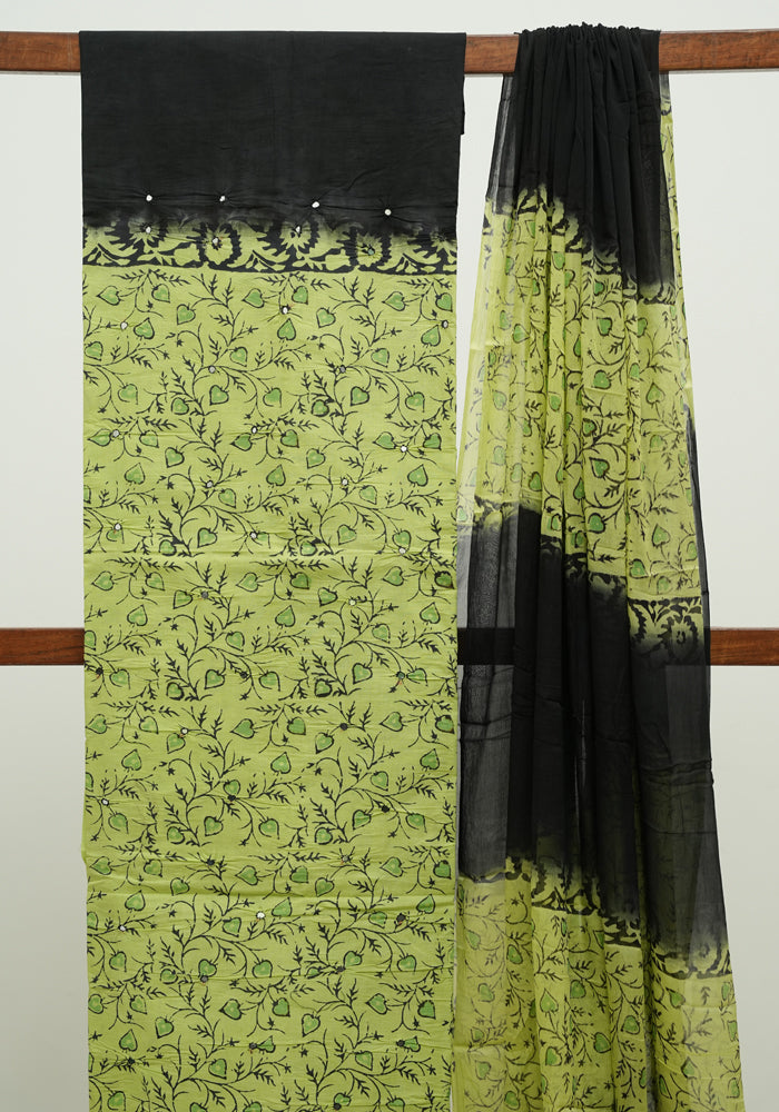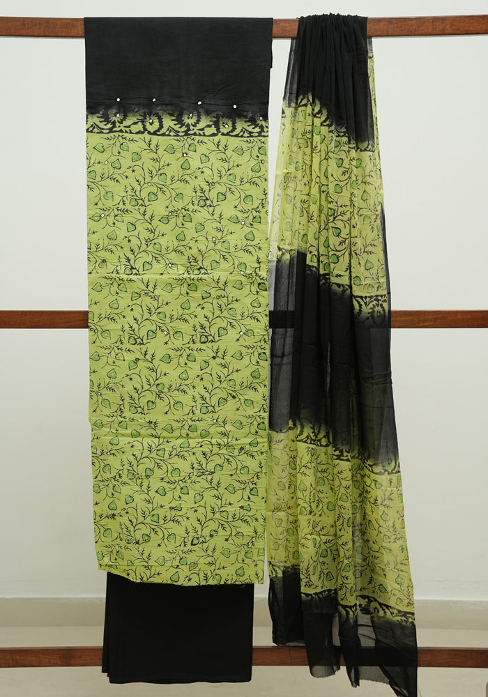 Light Green and Black Unstitched Cotton Salwar Set With Mirror Work