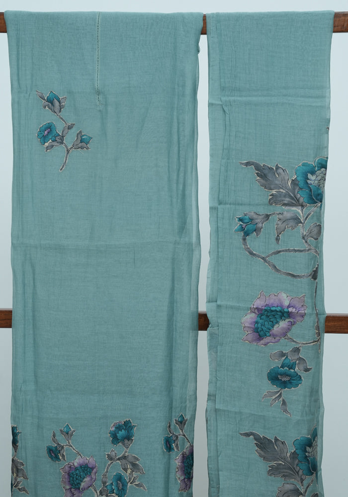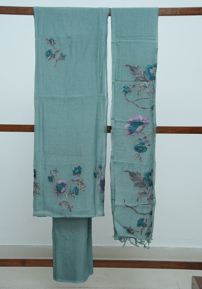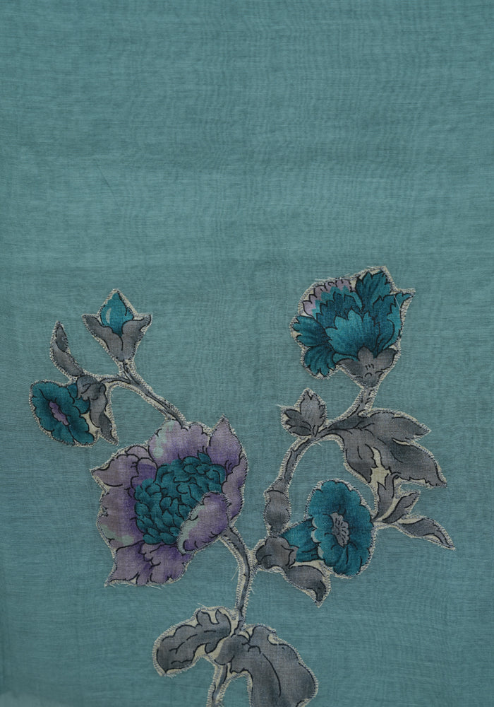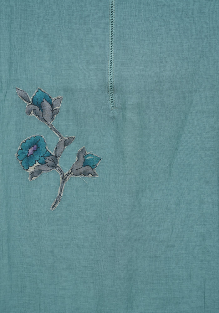 Blue Unstitched Malai Chanderi Salwar Set with Applique Work is OUT OF STOCK currently and available on pre-payment only. Order now for delivery within 2 weeks.