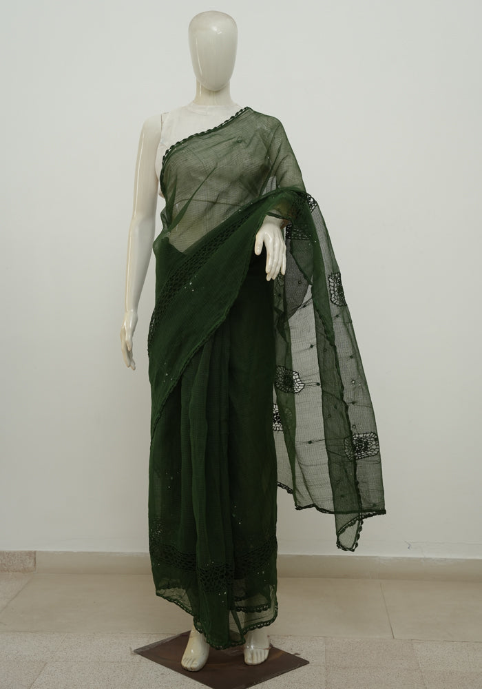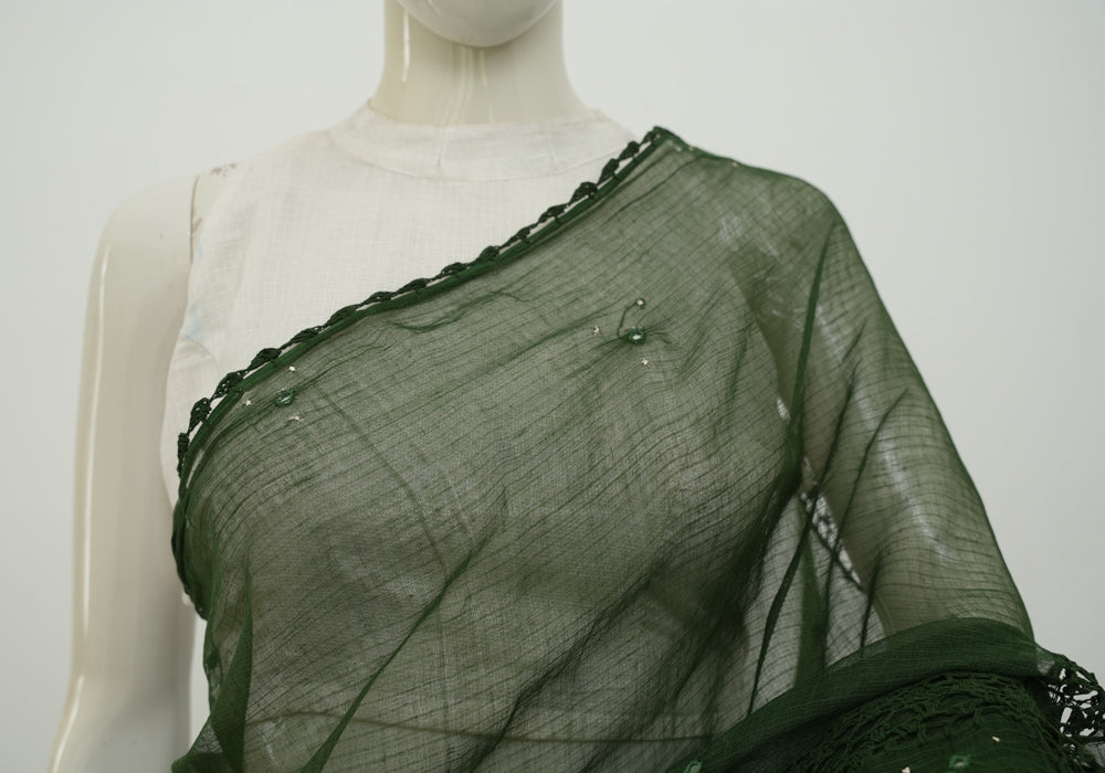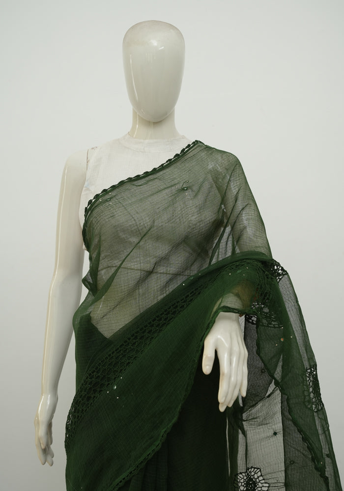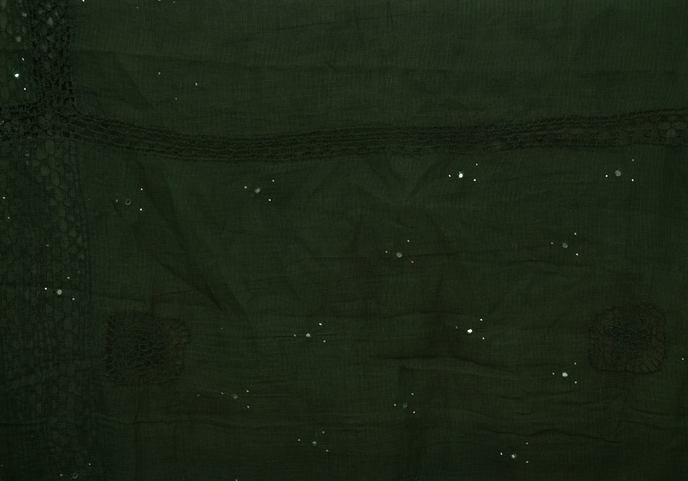 Bottle Green Kota Saree With Mirror and Crochet Work