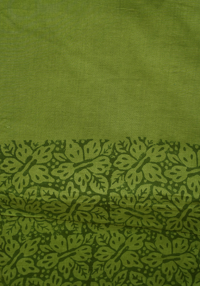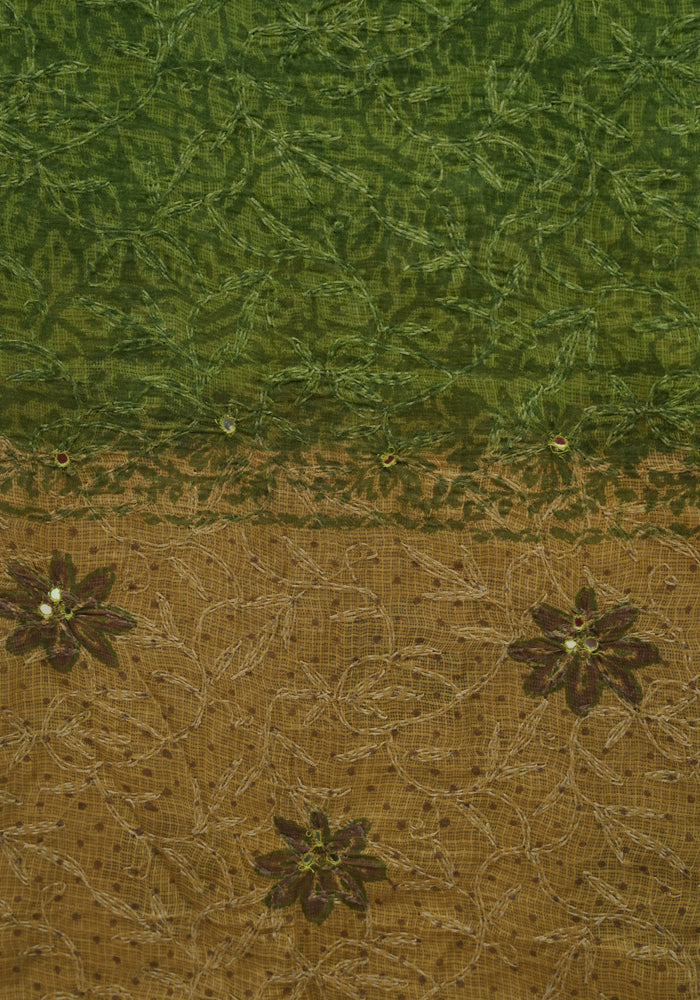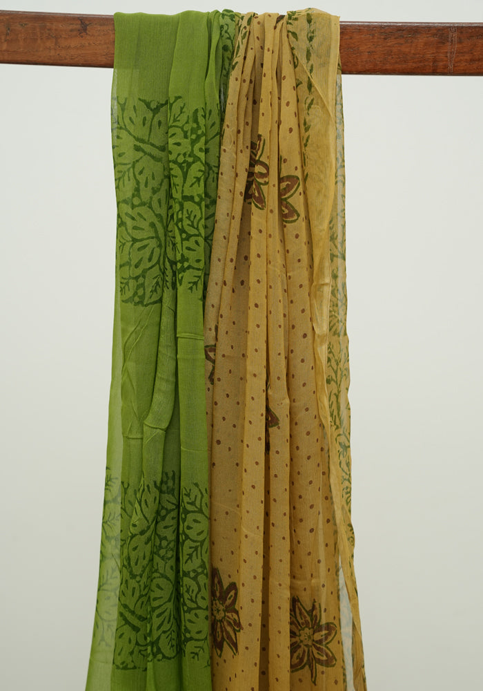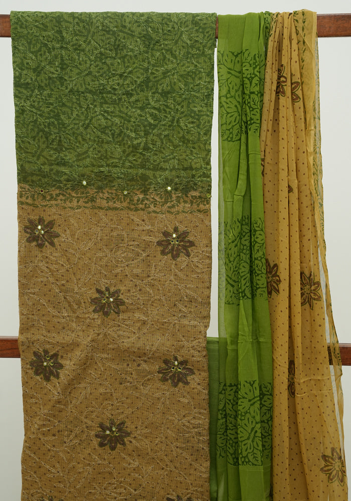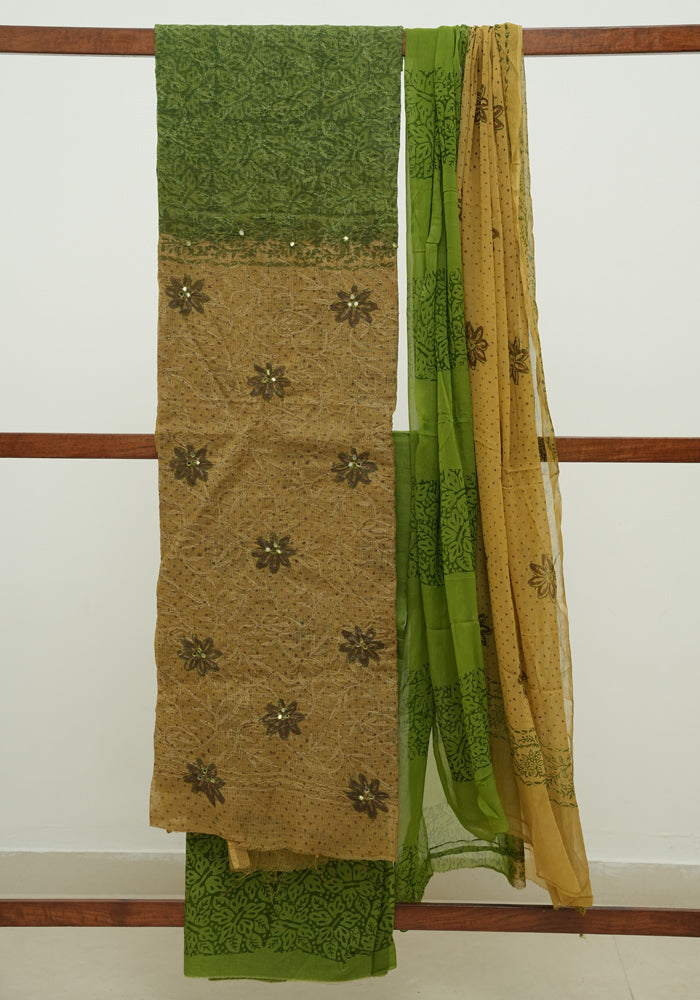 Brown and Green Block Printed Tepchi Kota Unstitched Salwar Set With Mirror Work