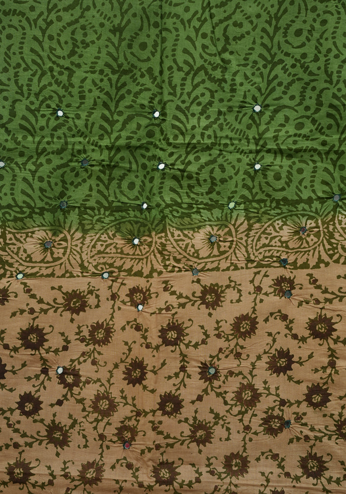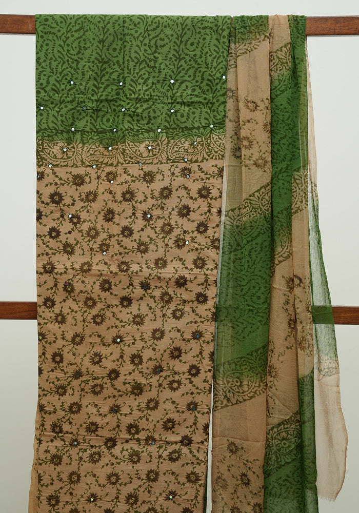 Brown and Olive Green Unstitched Cotton Salwar Set With Mirror Work