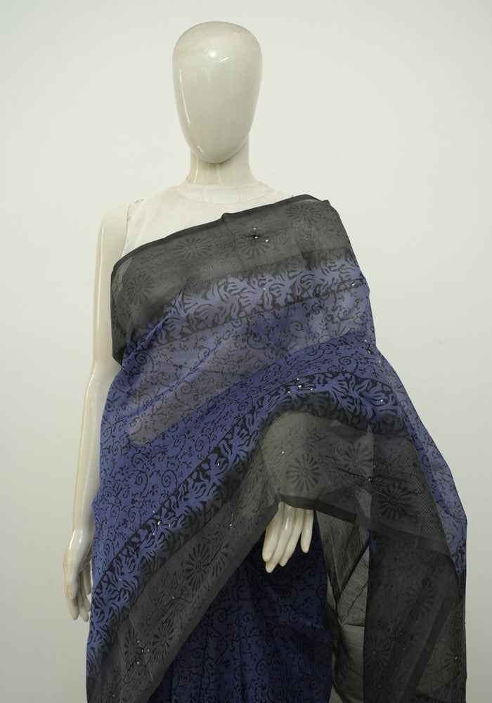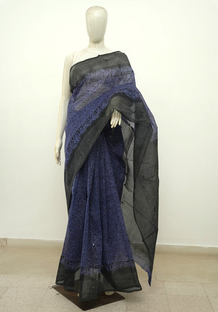 Cobalt Blue and Grey Block Printed Supernet Kota saree With Mirror and Badla Work