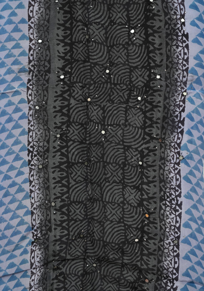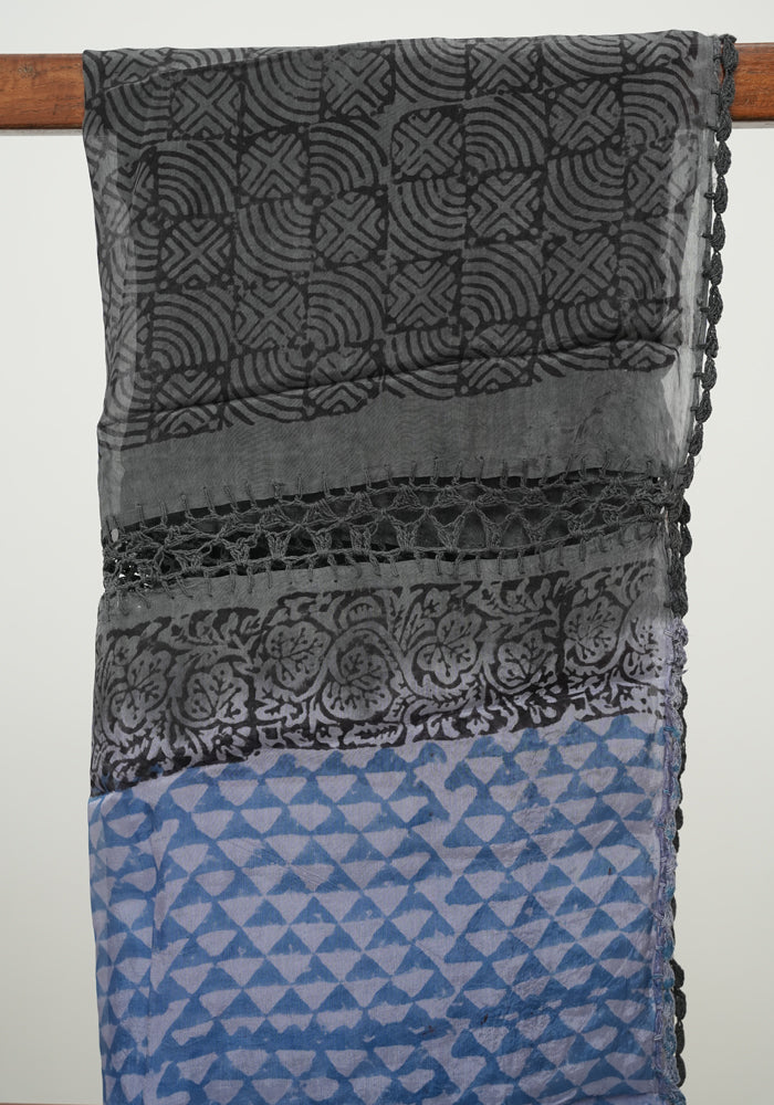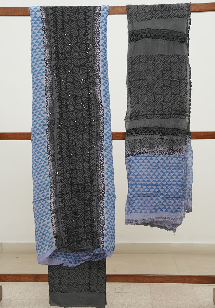 Cobalt Blue and Grey Unstitched Blockprinted Semi Organza Salwar Set With Crochet Dupatta