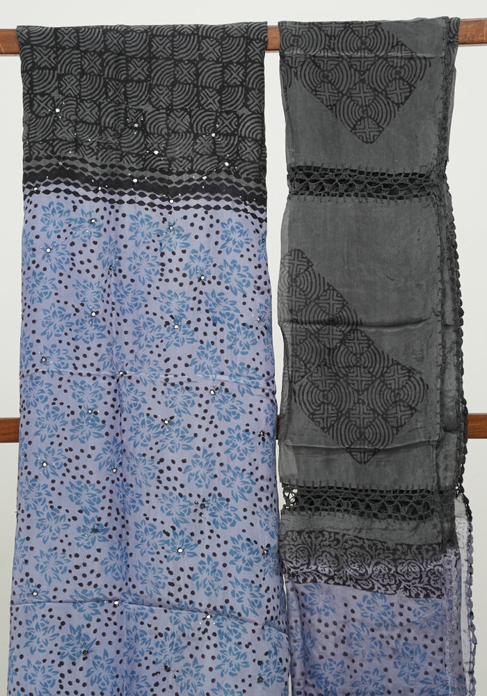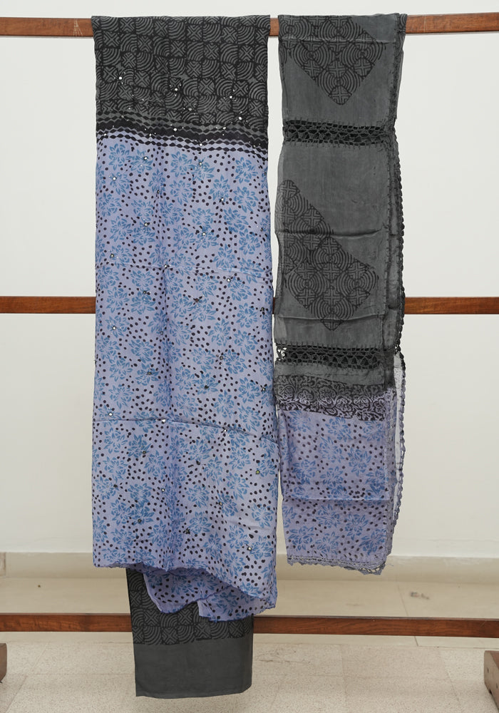 Cobalt Blue and Grey Unstitched Blockprinted Semi Organza Salwar Set With Crochet Dupatta
