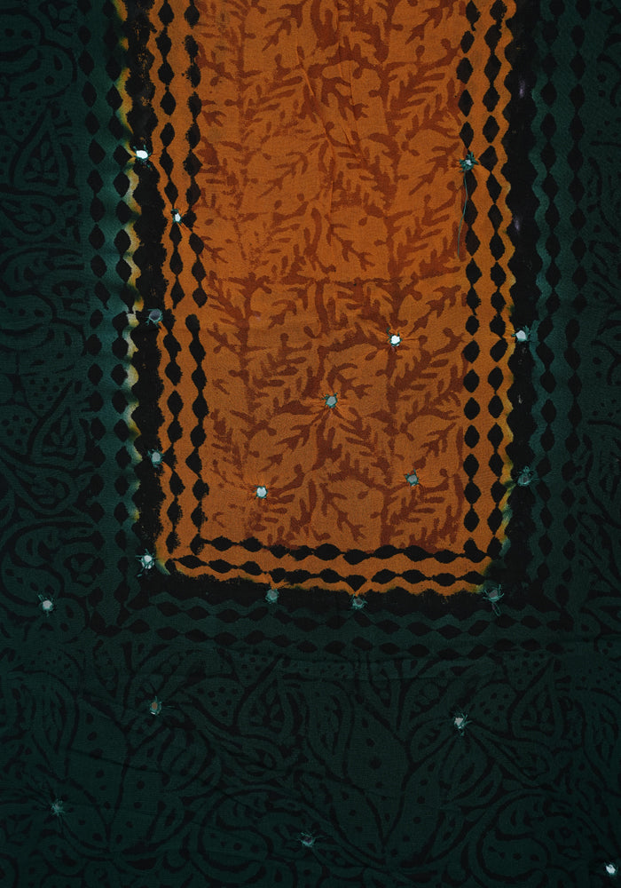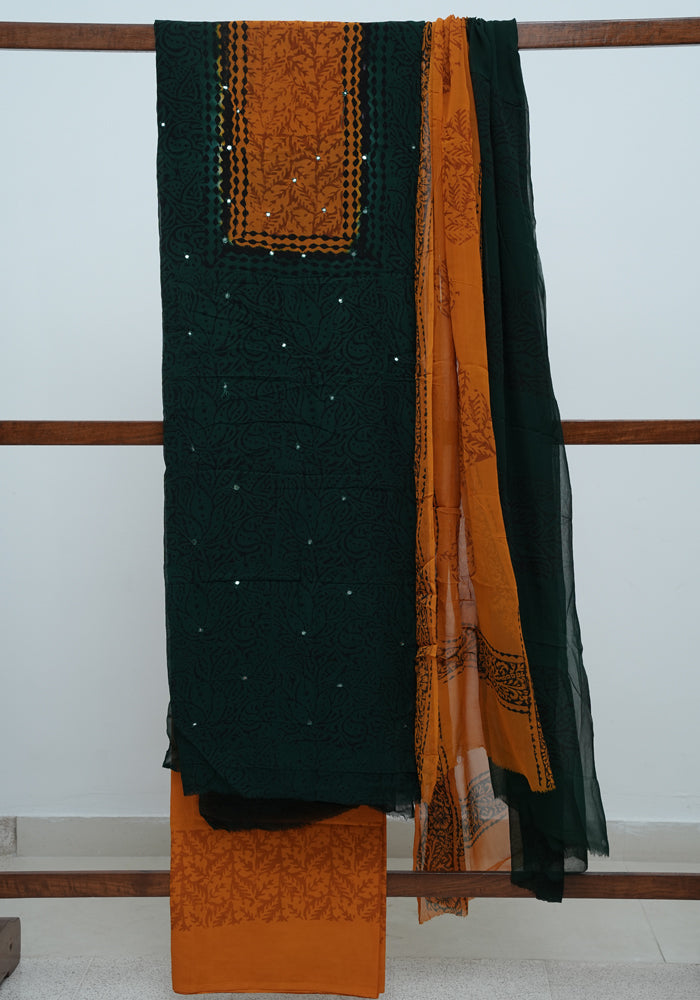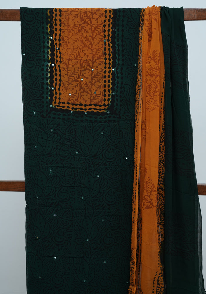 Dark Green and Mango Yellow Unstitched Georgette Salwar Set with Mirror Work