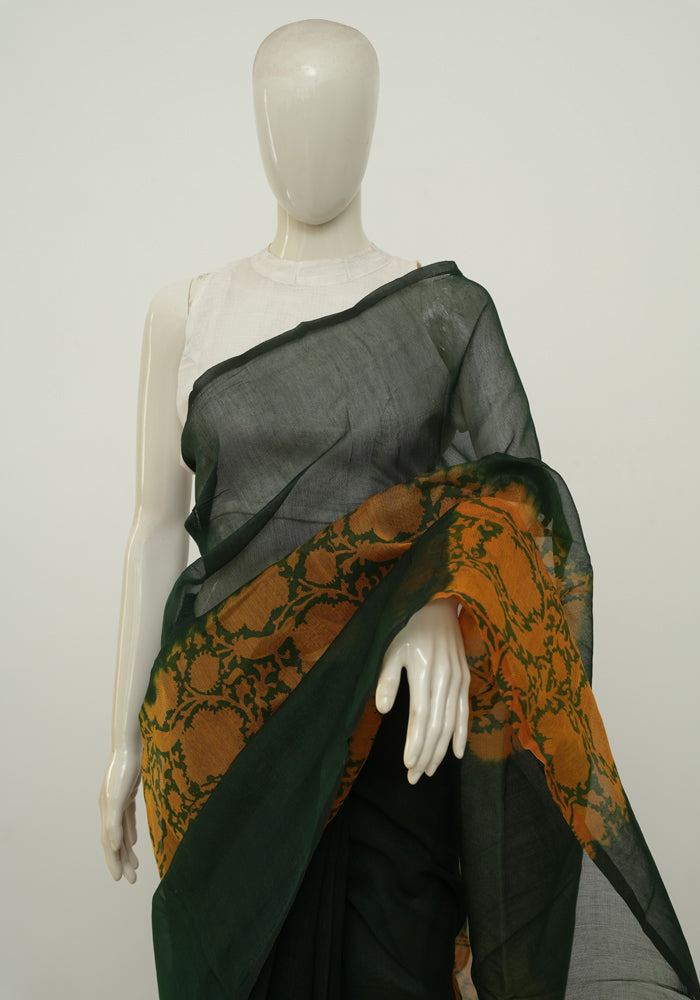 Dark Green and Mustard Yellow Block printed Supernet Kota Saree