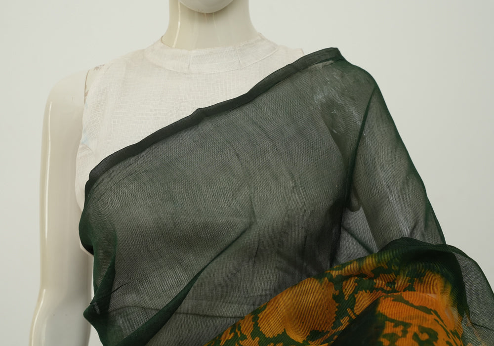 Dark Green and Mustard Yellow Block printed Supernet Kota Saree is OUT OF STOCK currently and available on pre-payment only. Order now for delivery within 2 weeks.