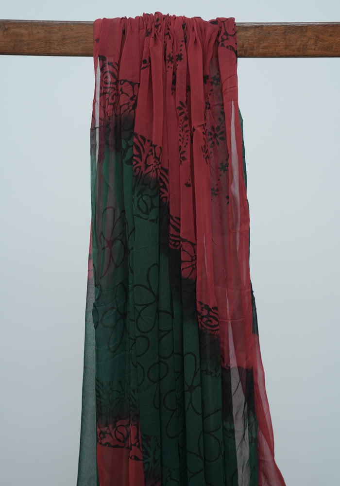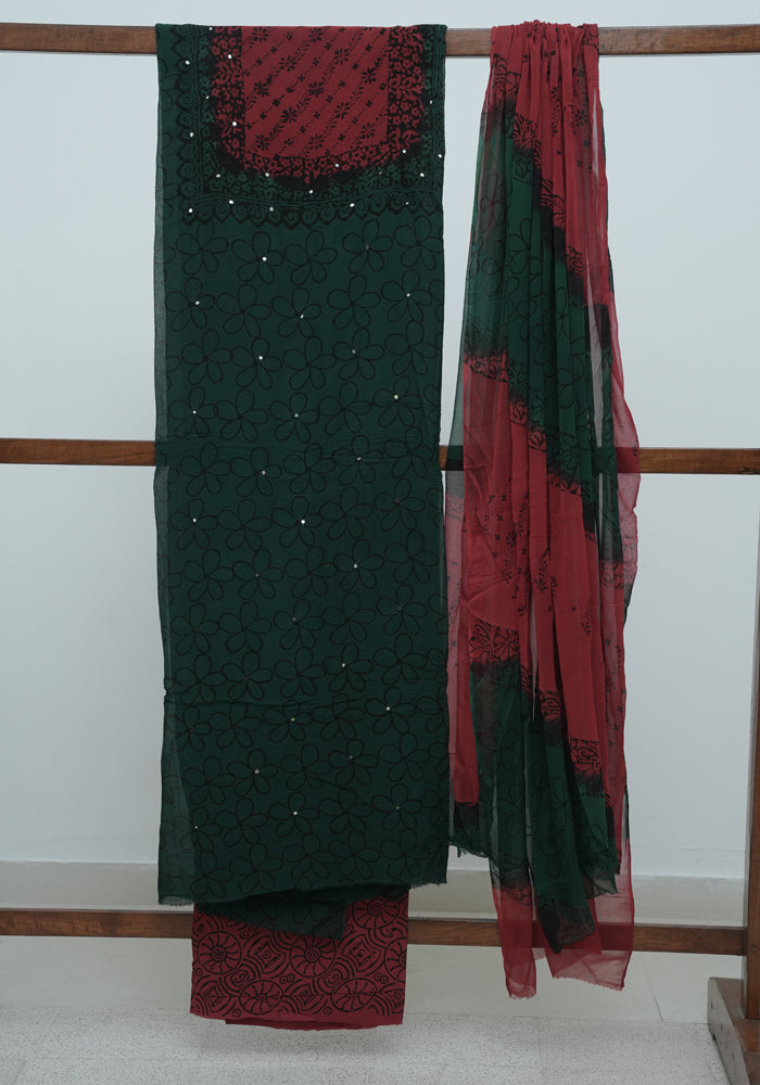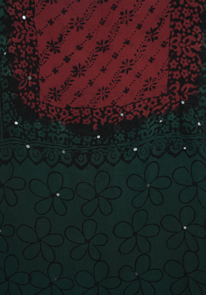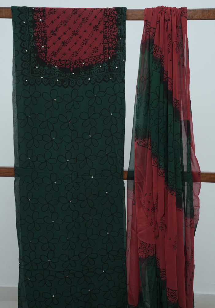 Dark Green and Red Unstitched Georgette Salwar Set with Mirror Work