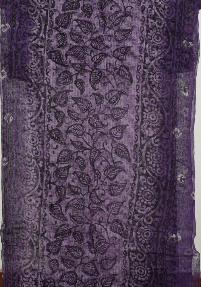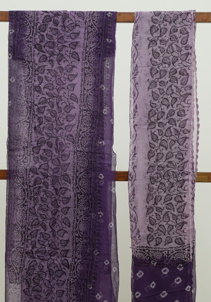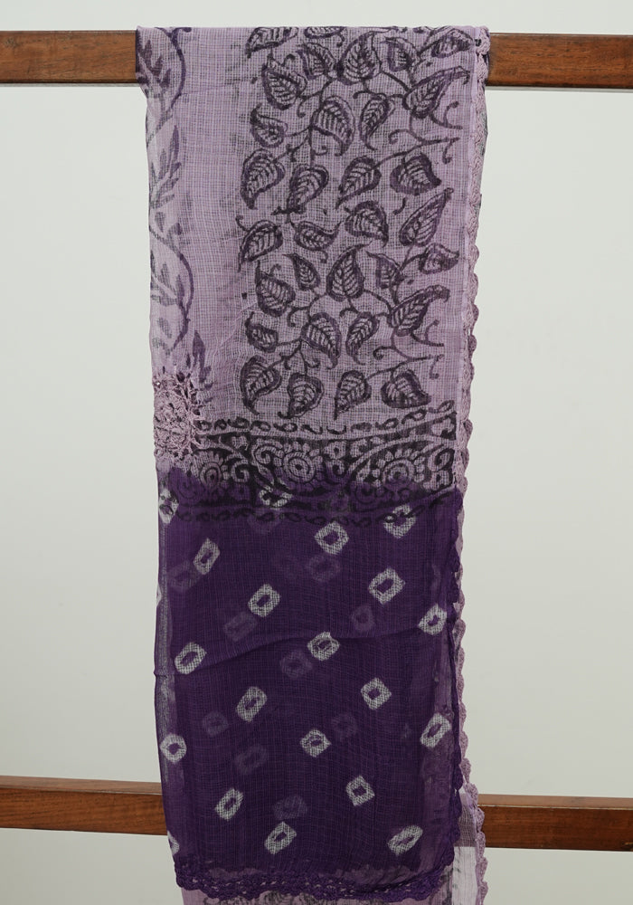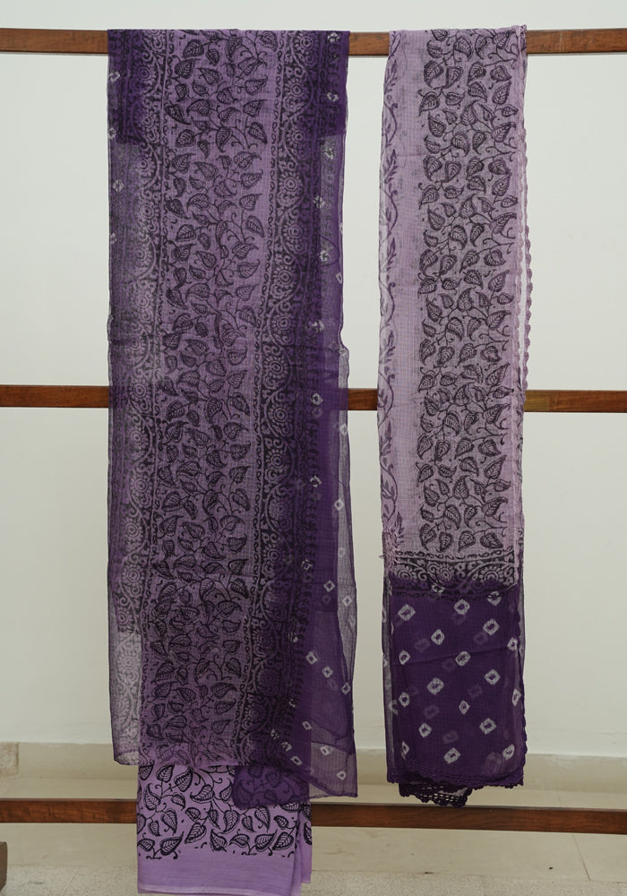 Dark Purple and Light Purple Unstitched Block Printed Kota Salwar Set With Bandini and Crochet Dupatta